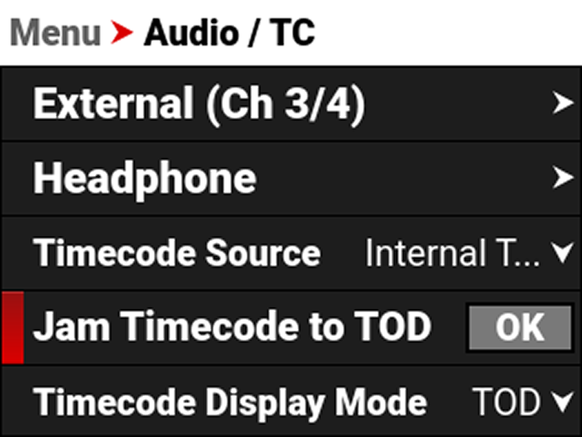 - When you select Internal TOD, you can navigate to JAM Timecode to TOD and press SEL to synchronize the Timecode to the camera's internal clock.