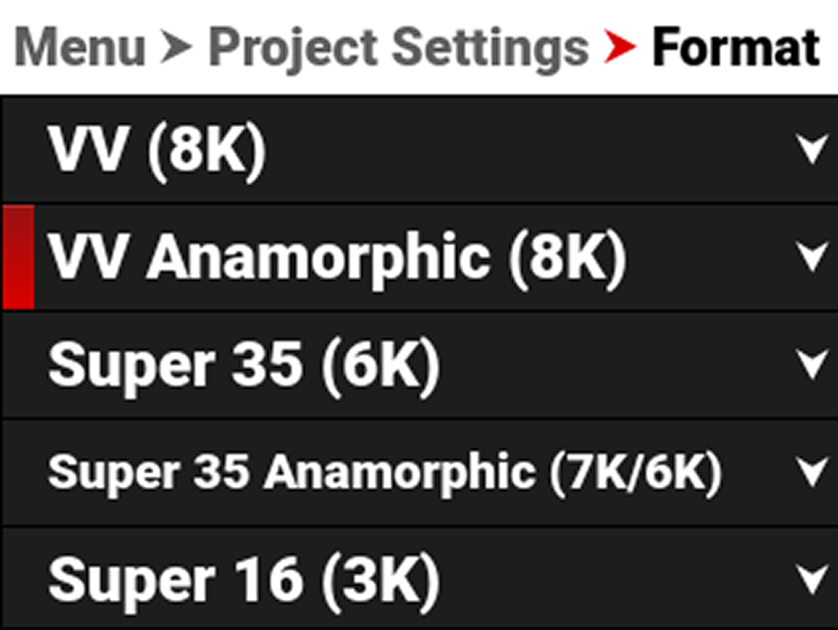 Use the VV Anamorphic (8K) format setting to designate how much of the sensor the camera should use to capture anamorphic images with the appropriate de-squeeze ratio.