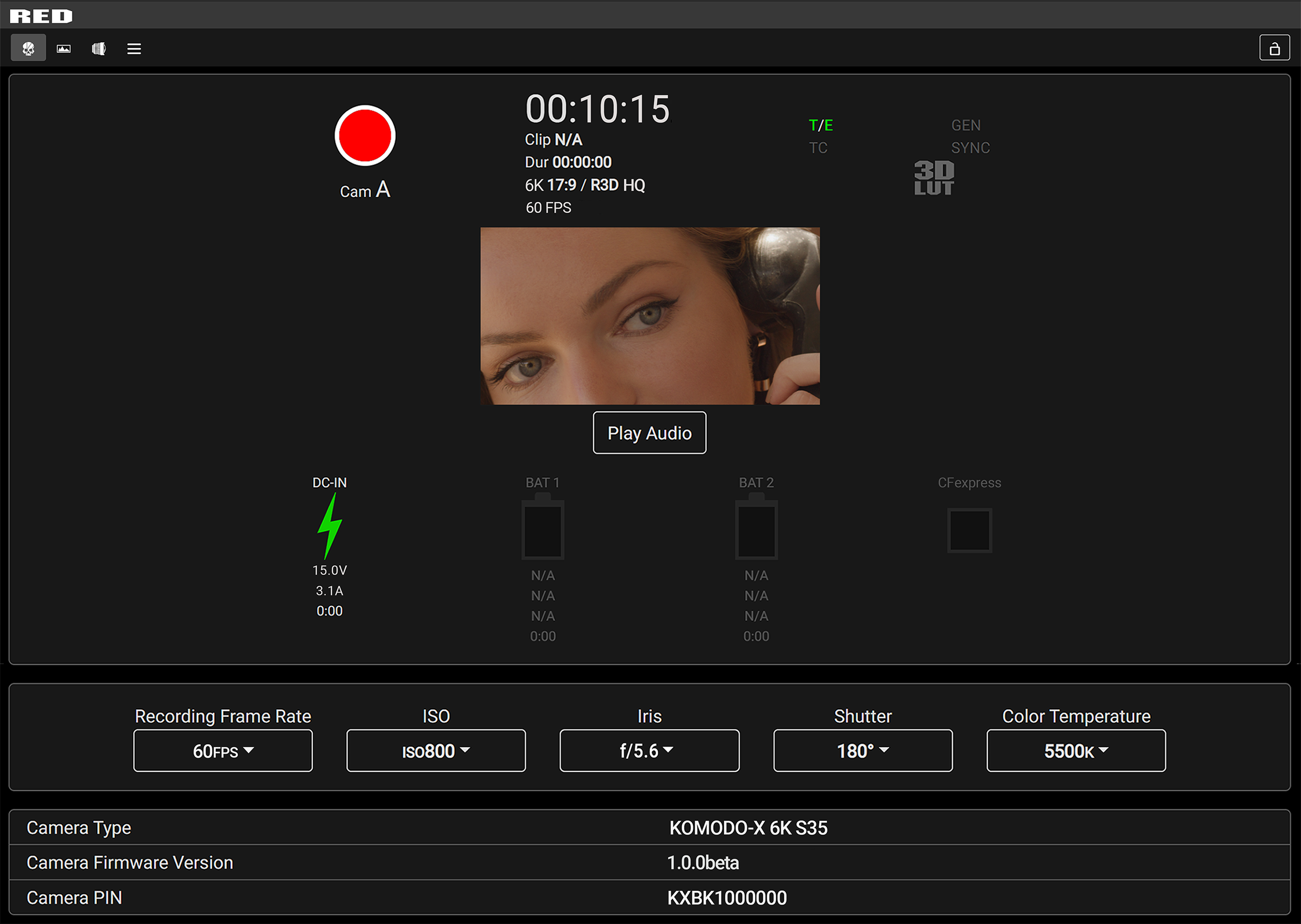- Tap the camera icon to open the RED Control app tools for the networked camera.