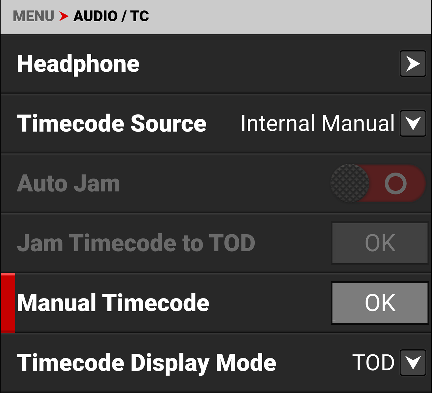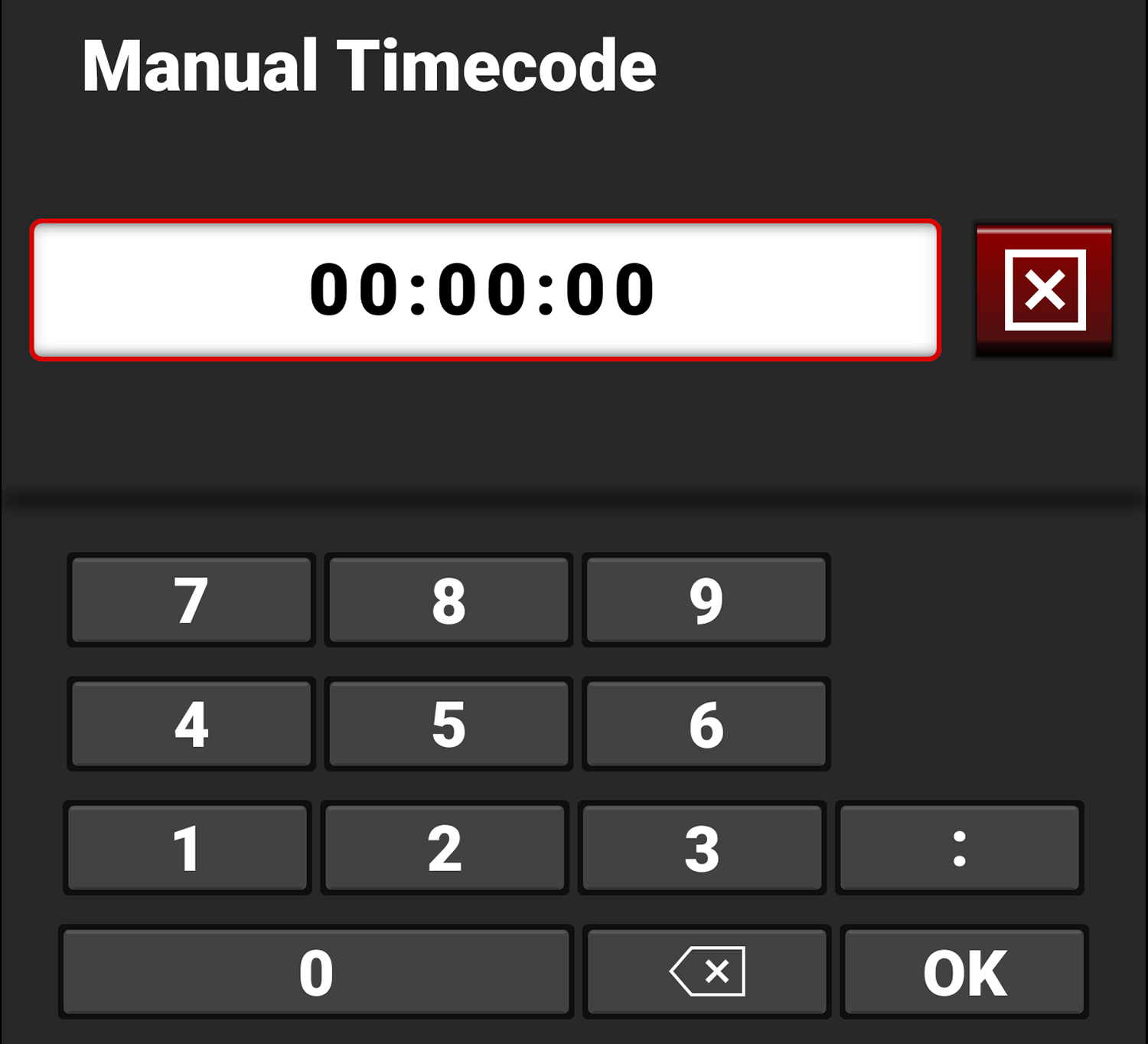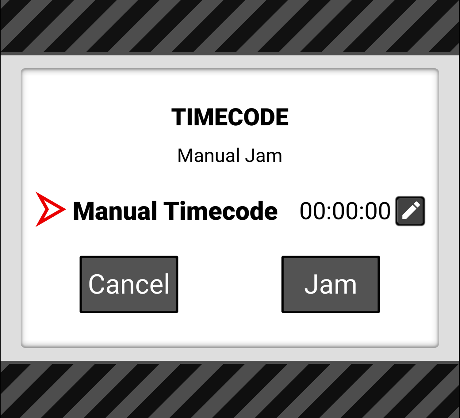 Select JAM to jam to the internal Timecode or select Manual Timecode to open the editing screen: