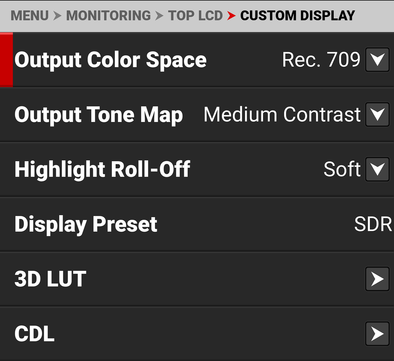 You can select the look of the image preview signal sent to the Top LCD. The selections include: • Image / LUT (default) • REDWideGamutRGB / Log3G10 • Custom Display (enables the Custom Display menu) |