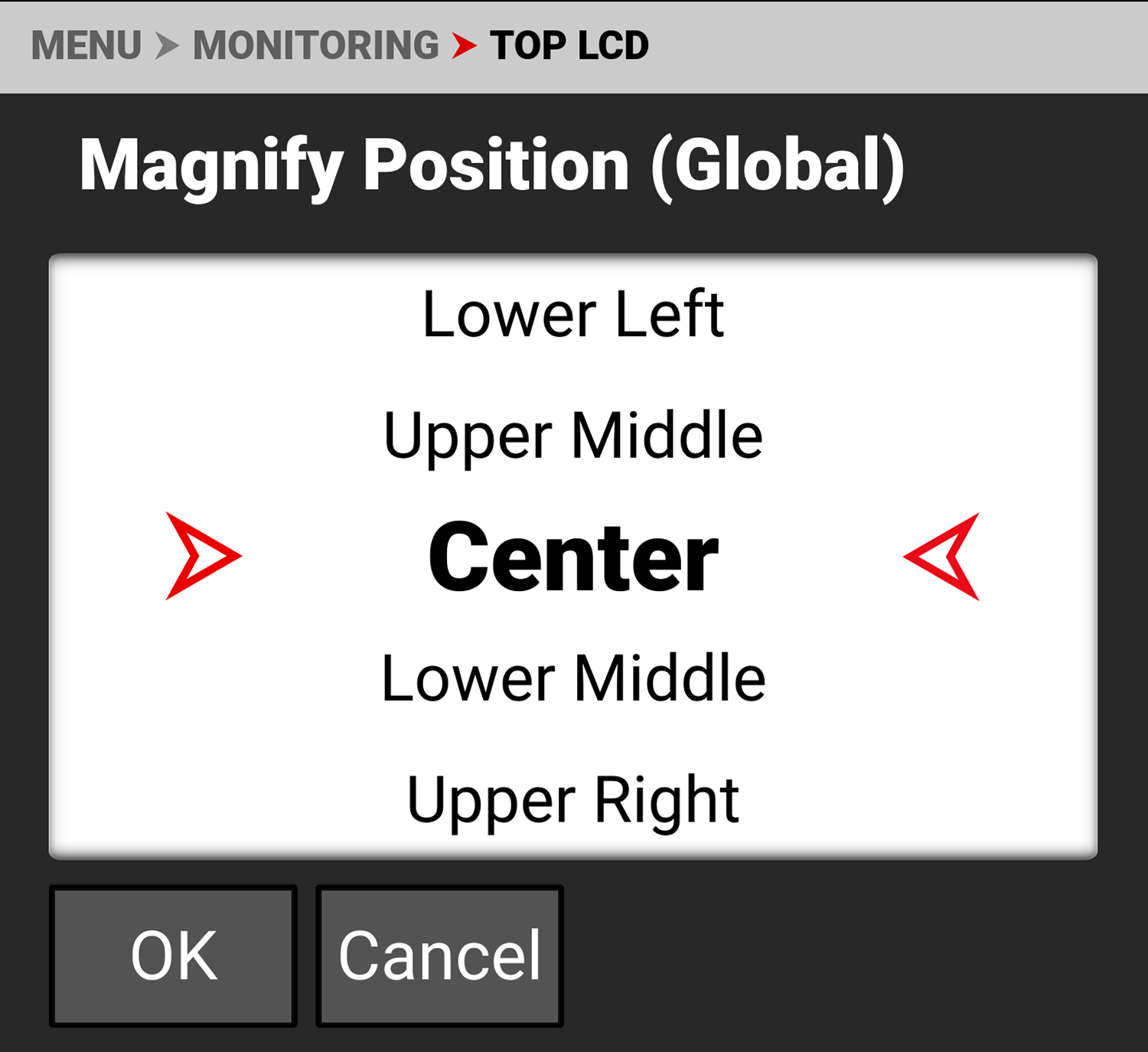 Use Magnify Position (Global) to select the position of the magnified area for all LCD magnification.