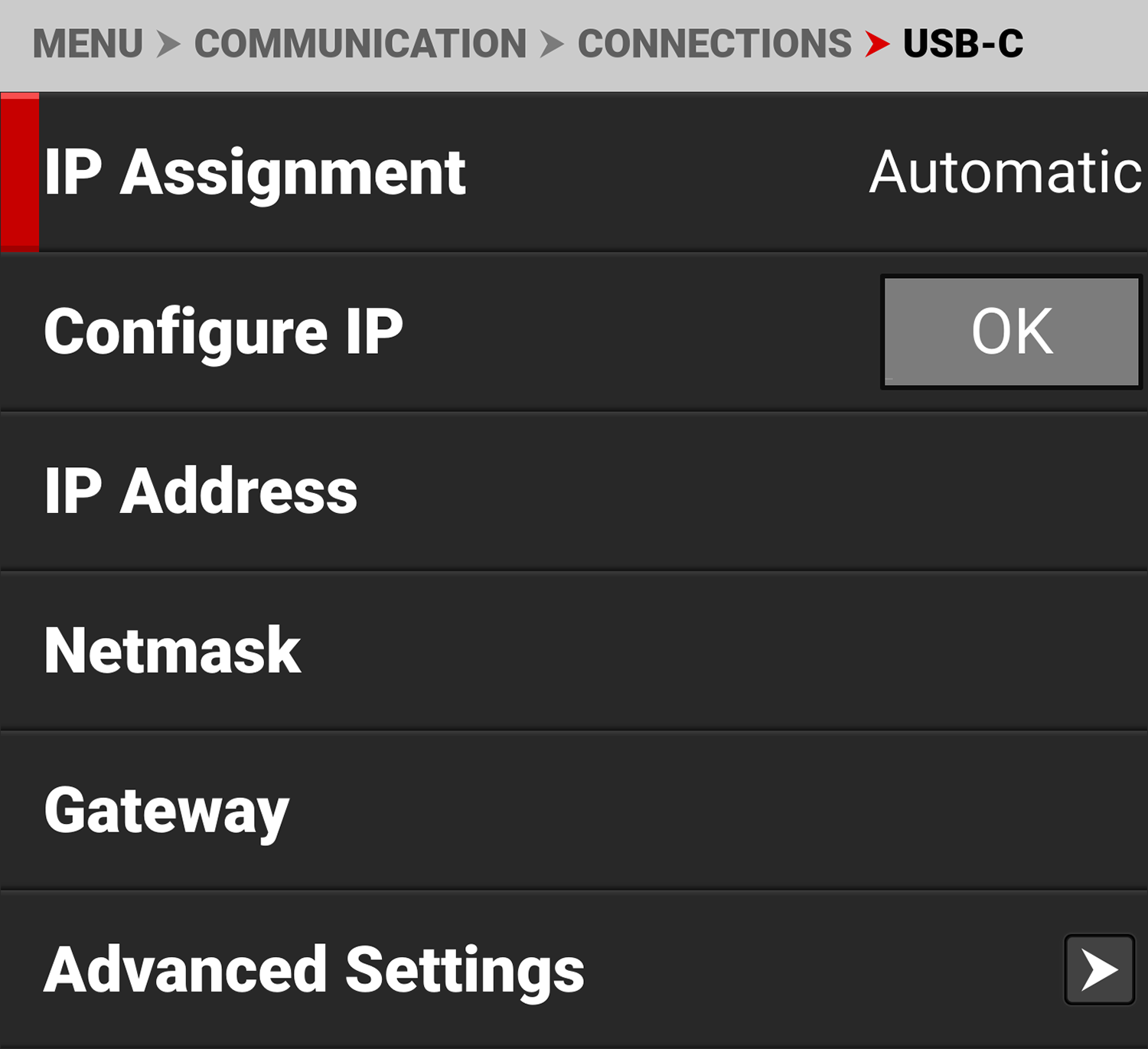 When connected to an Ethernet network and Automatic IP Assignment is enabled, Gateway displays the network Gateway address (router address).
