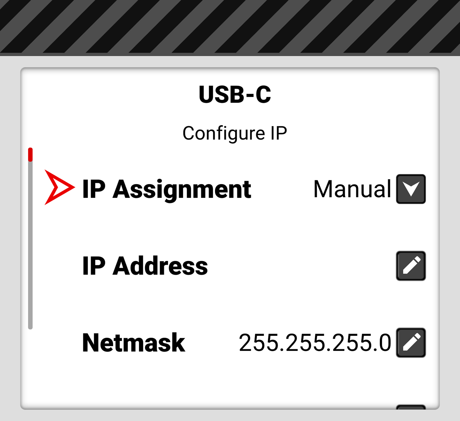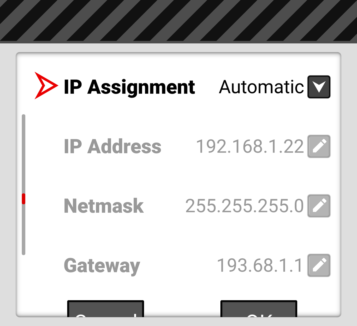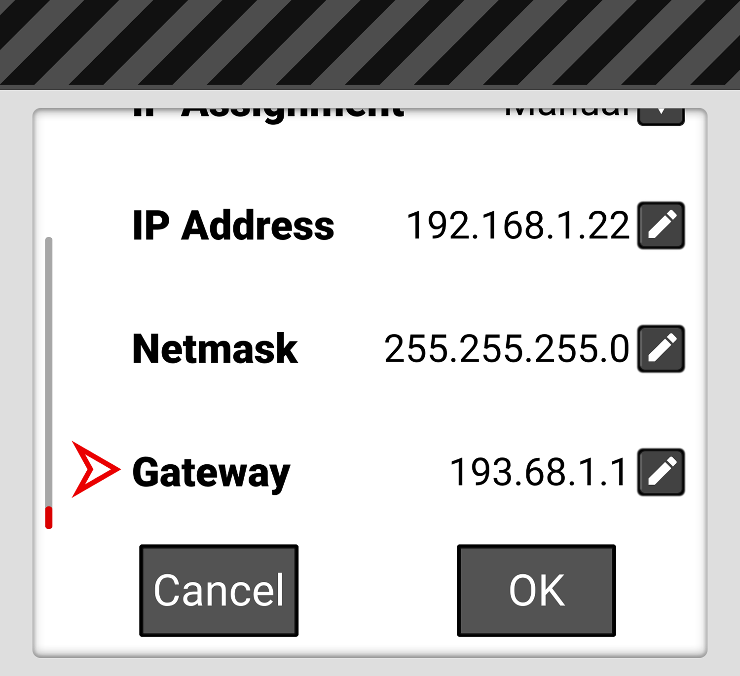 When Manual IP Assignment is enabled, you can select Gateway and manually enter a Gateway (router) address.
