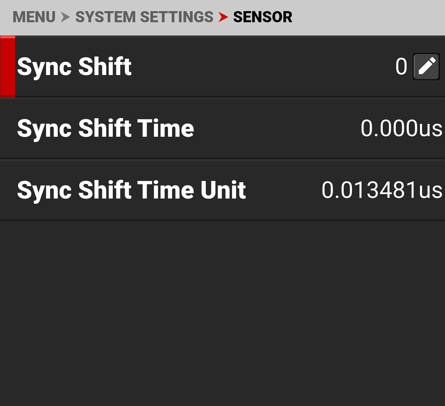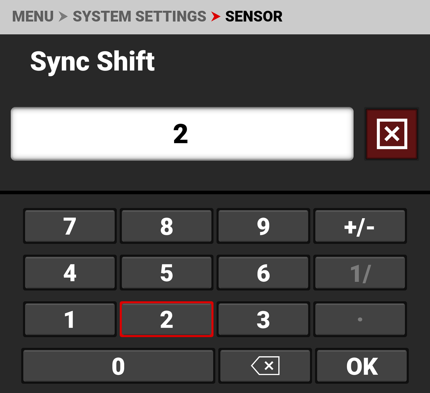 Use Sync Shift to open the keypad and enter the number of Sync Shift Time Units you want to offset the sensor from the external sync signal. Use this setting to resolve synchronization issues on set such as when working with LED Volumes.