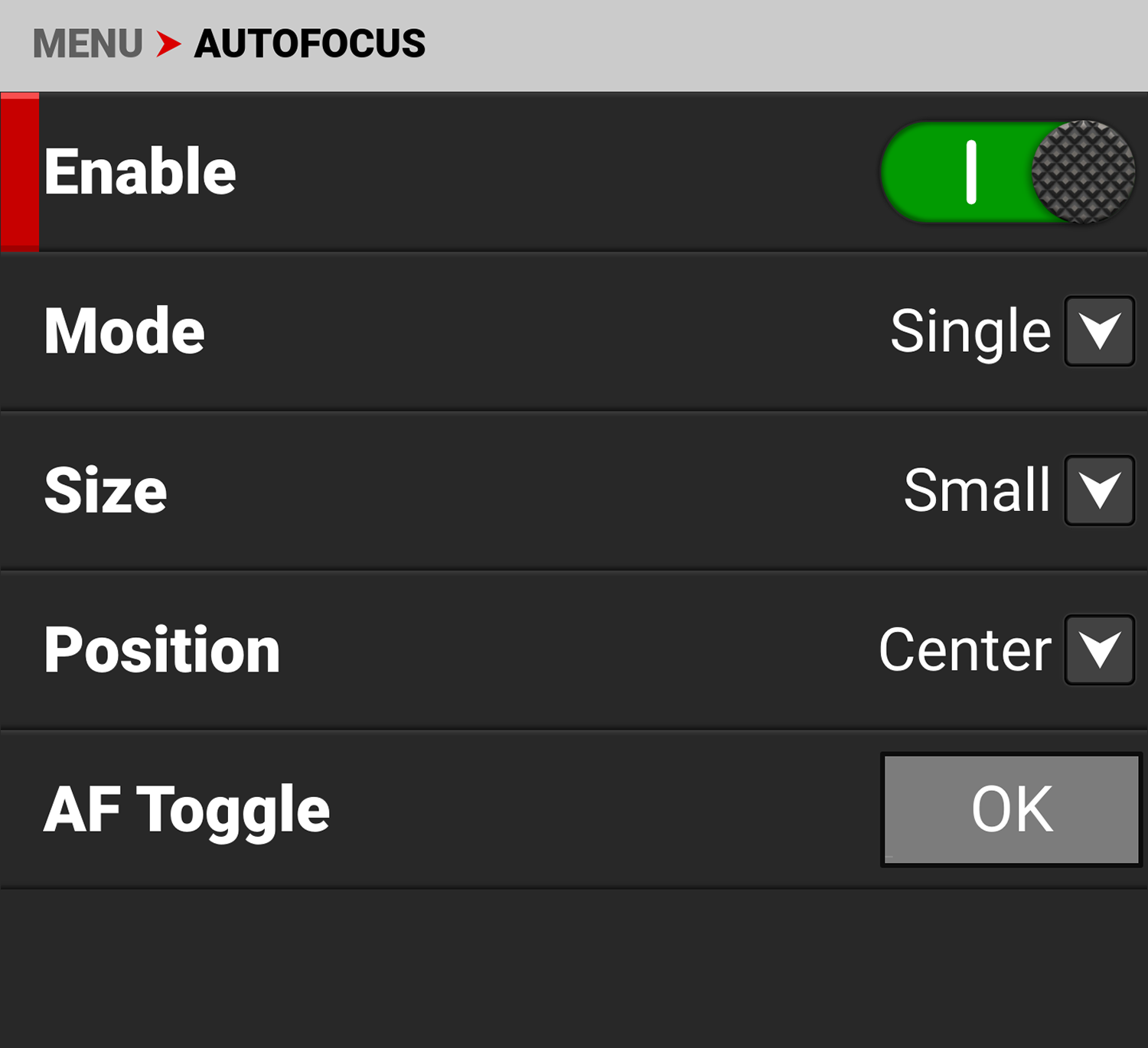 Use Autofocus to enable and configure the camera's Autofocus feature. The lens must support autofocus for this feature to work.