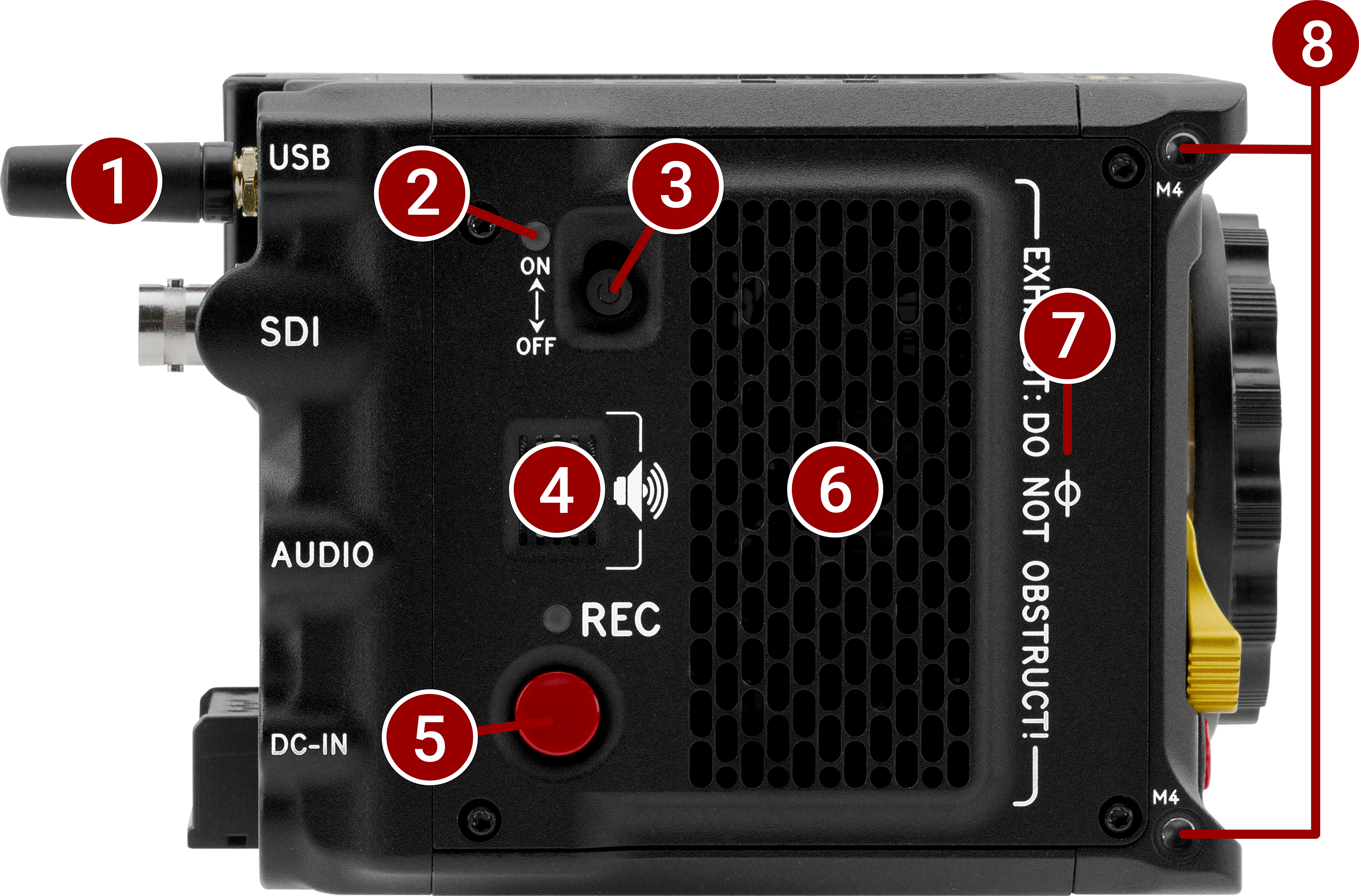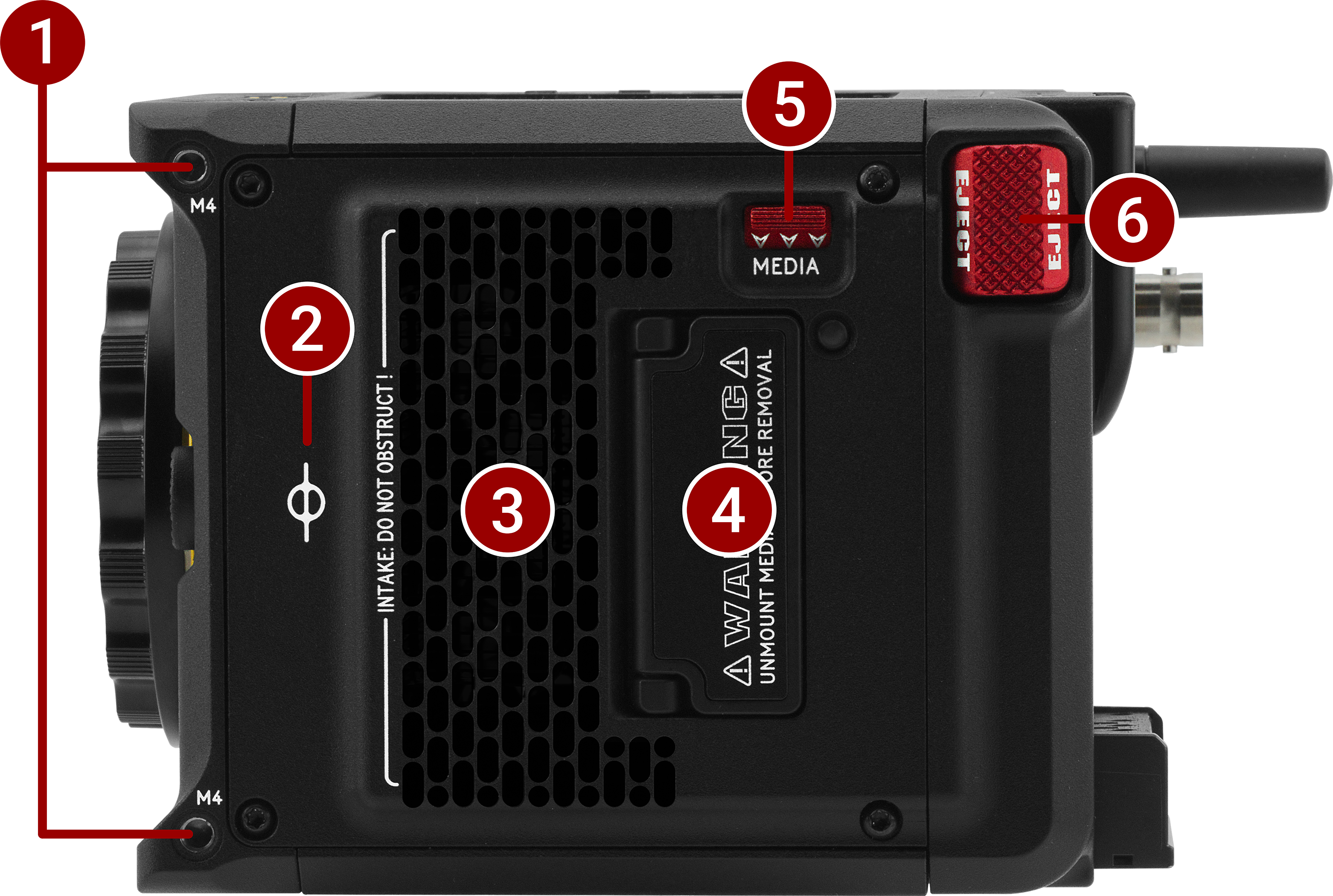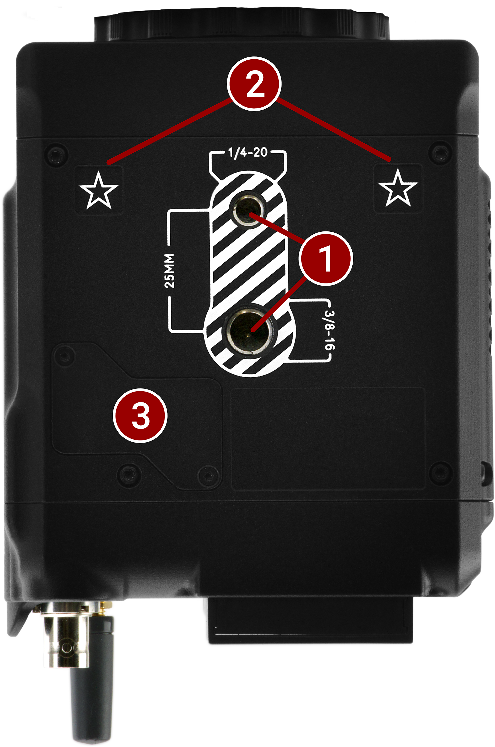 1/4-20 mounting holes for optional accessories (refer to Outrigger Handle, DSMC3™ RED® Touch 7.0" LCD) |