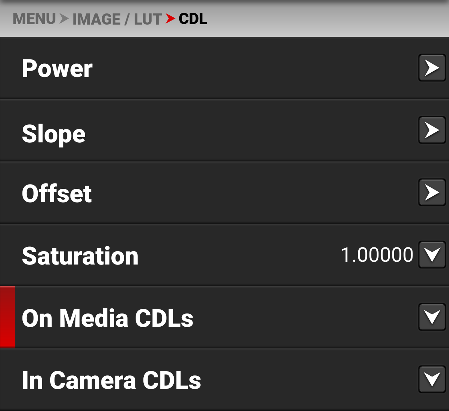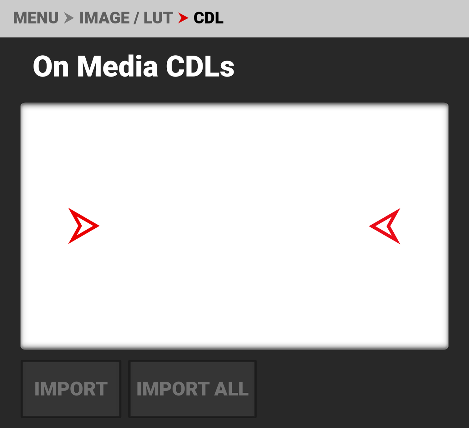 From On Media CDLs you can import a selected CDL from the media to the camera, or you can import all of the CDLs from the media to the camera.