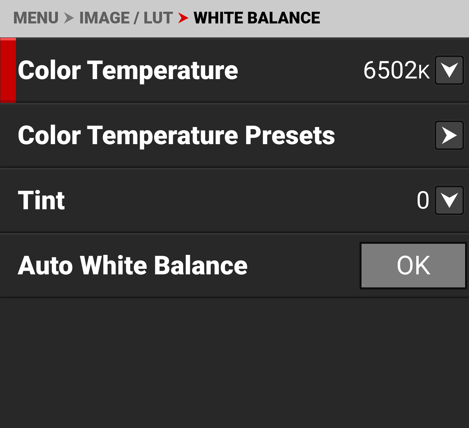 Use the White Balance menu to adjust the Color Temperature, Color Temperature Presets, Tint and execute the Auto White Balance.