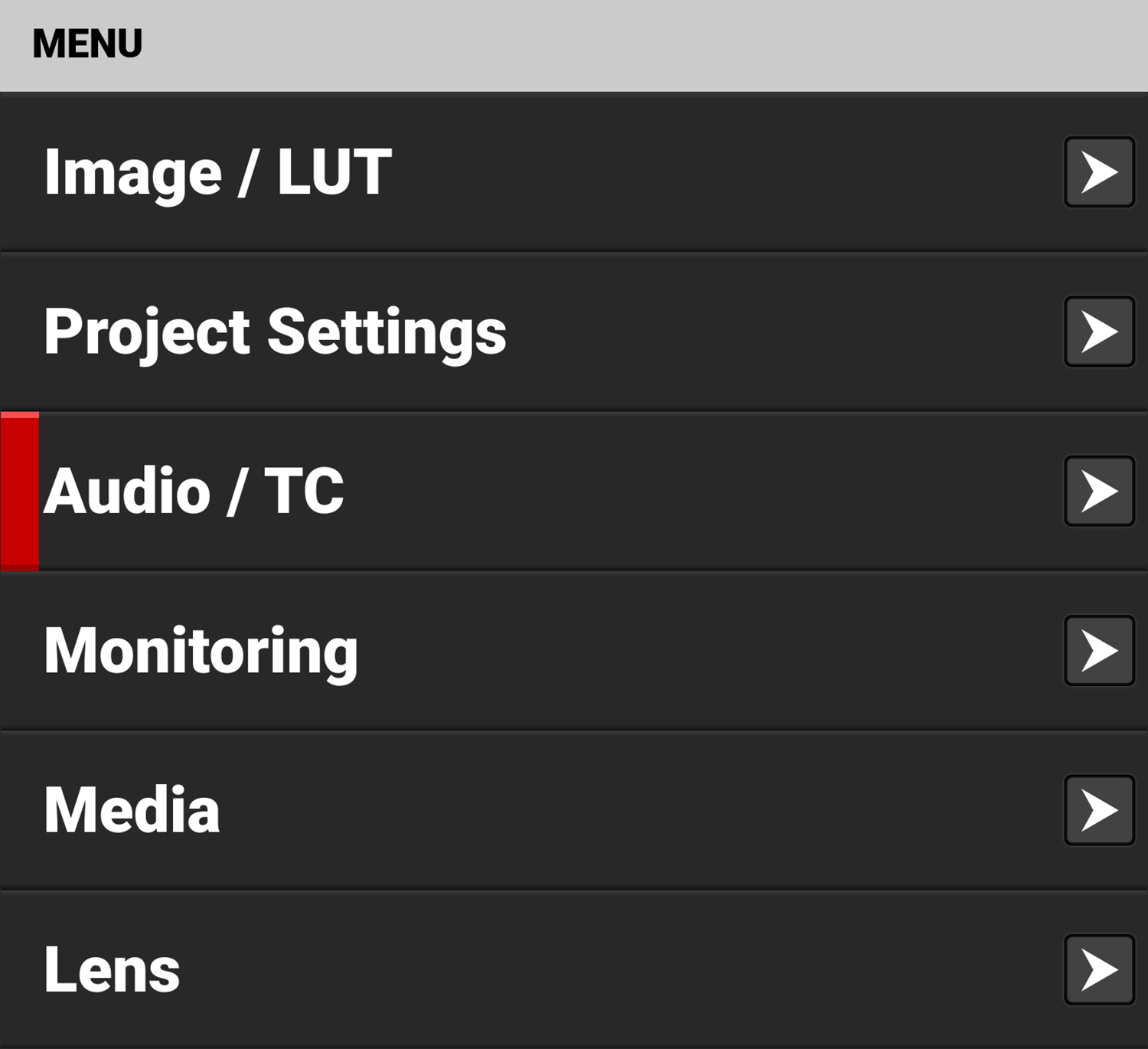 The Audio / TC menu contains the settings you use to configure your camera audio and Timecode.