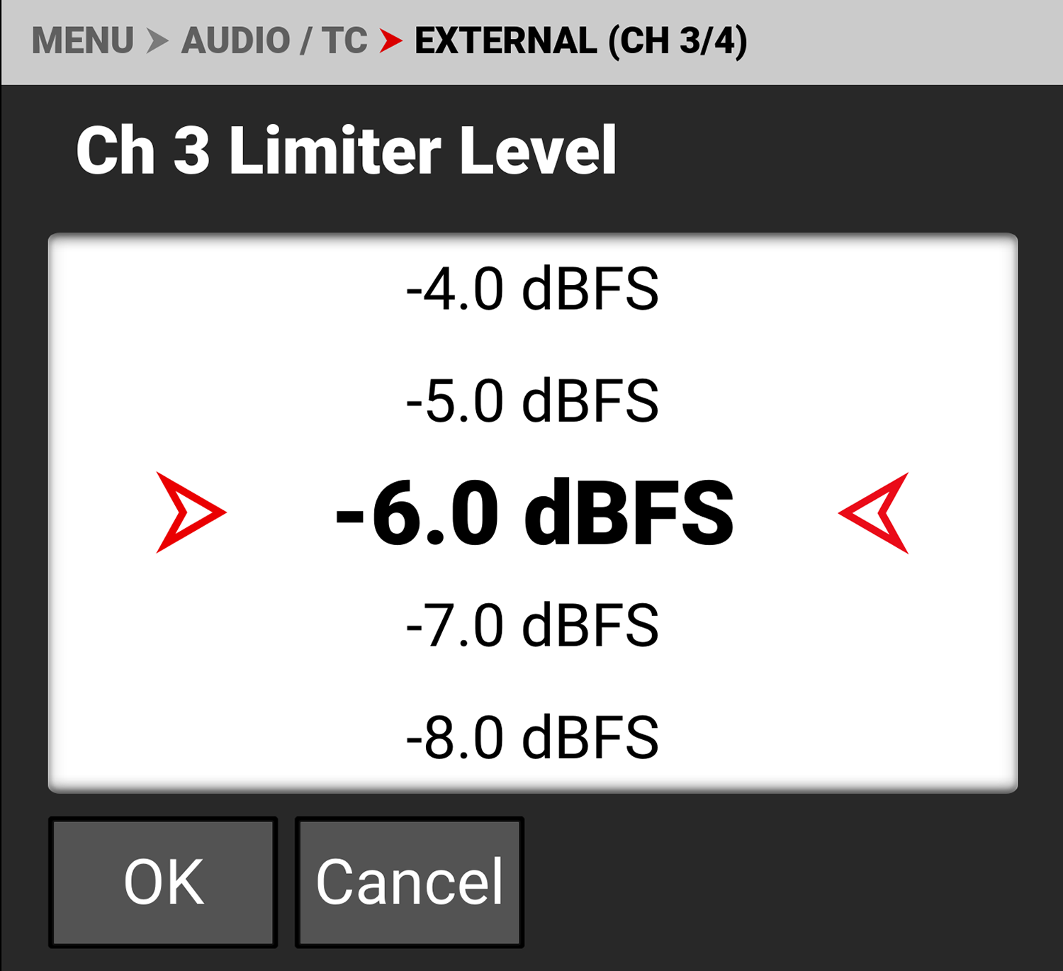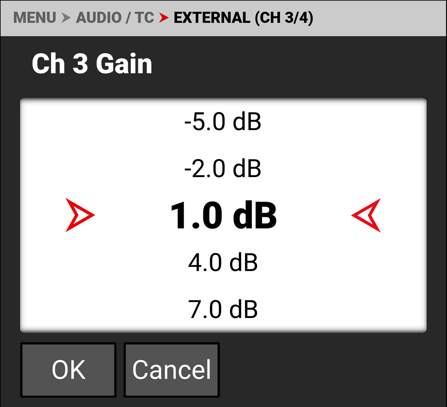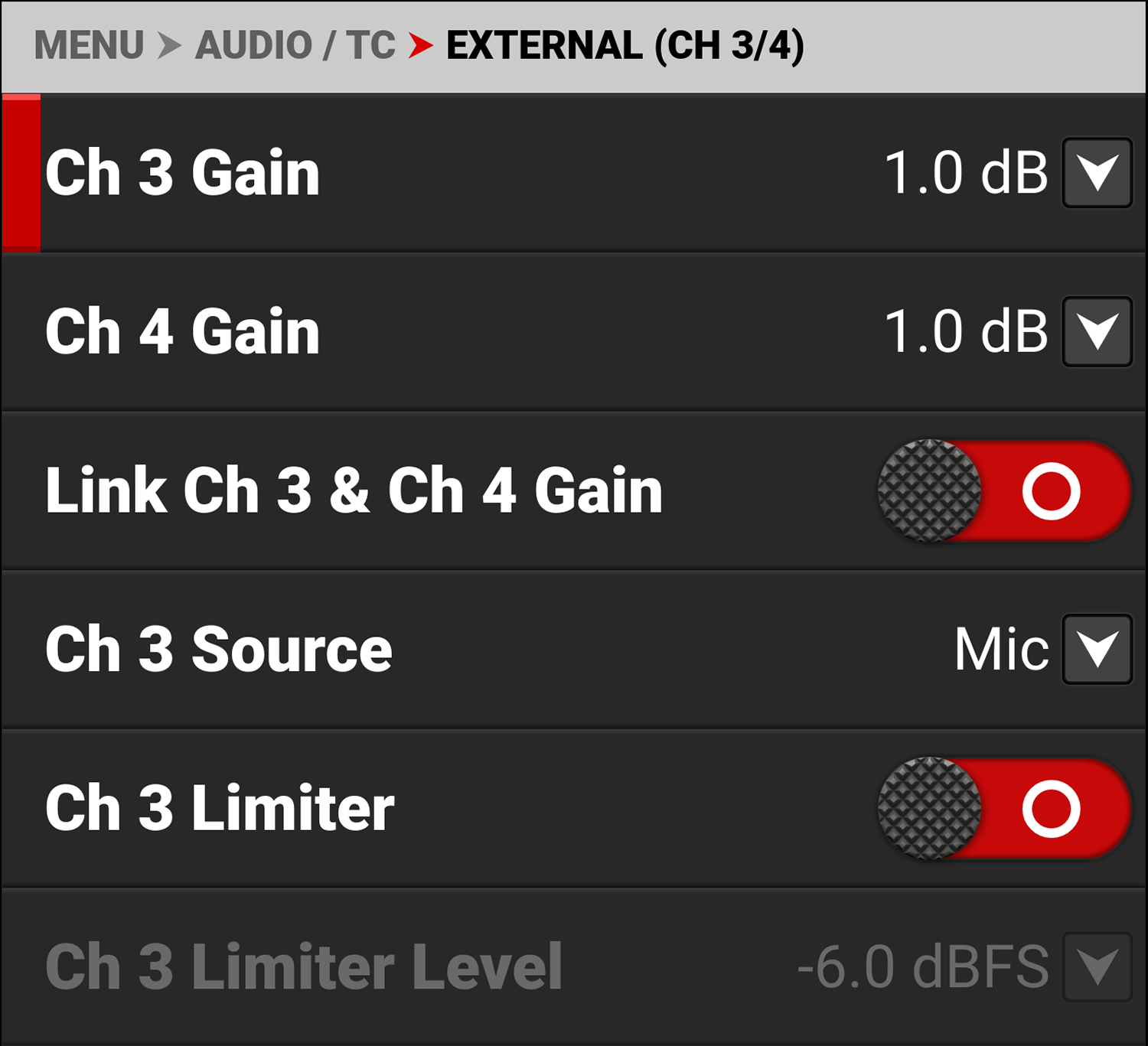 You can adjust the external audio levels for Ch 3 and Ch 4 from -8.0 dB to 34.0 dB.