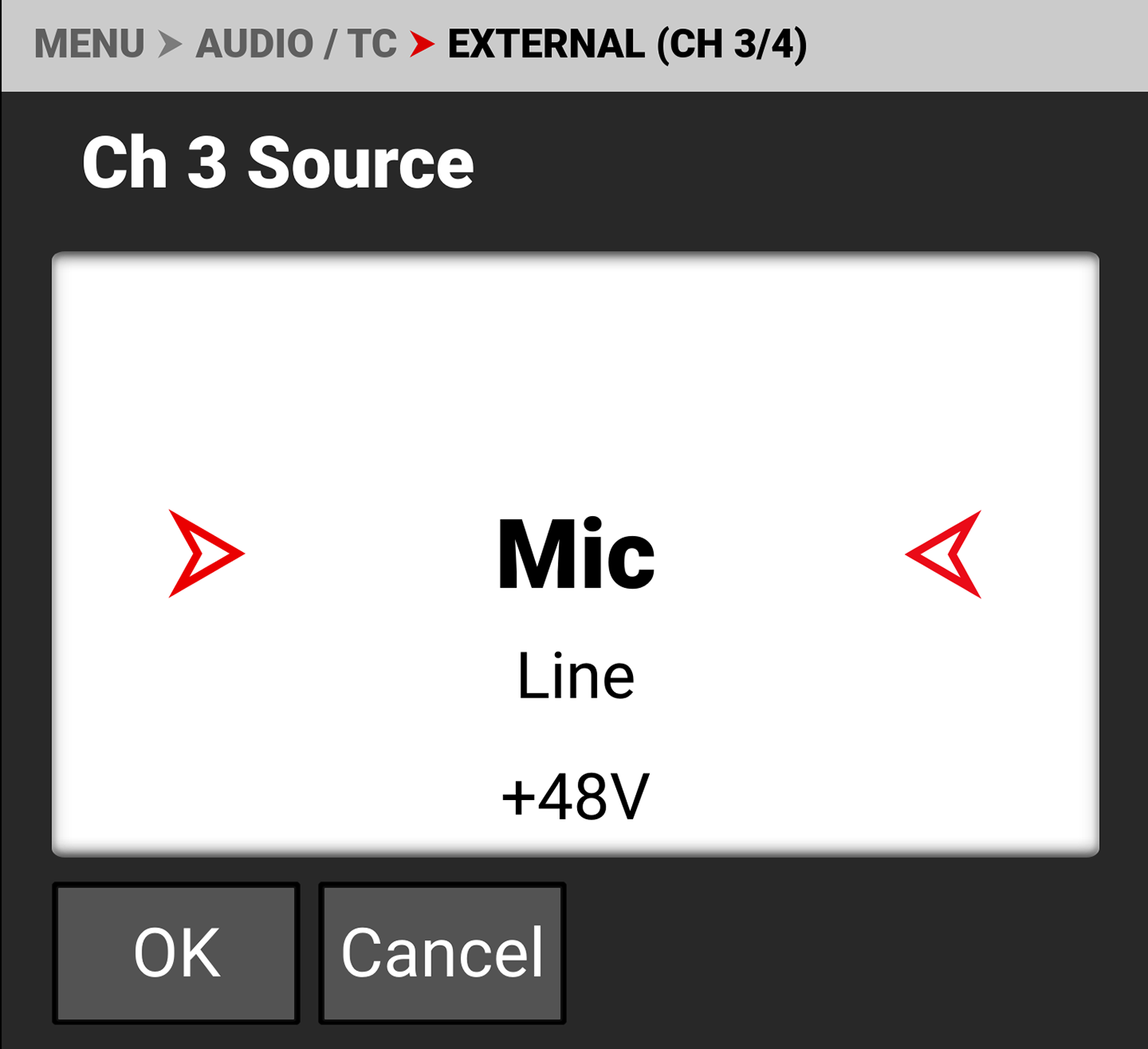 You can select microphone, line, or +48V phantom power.