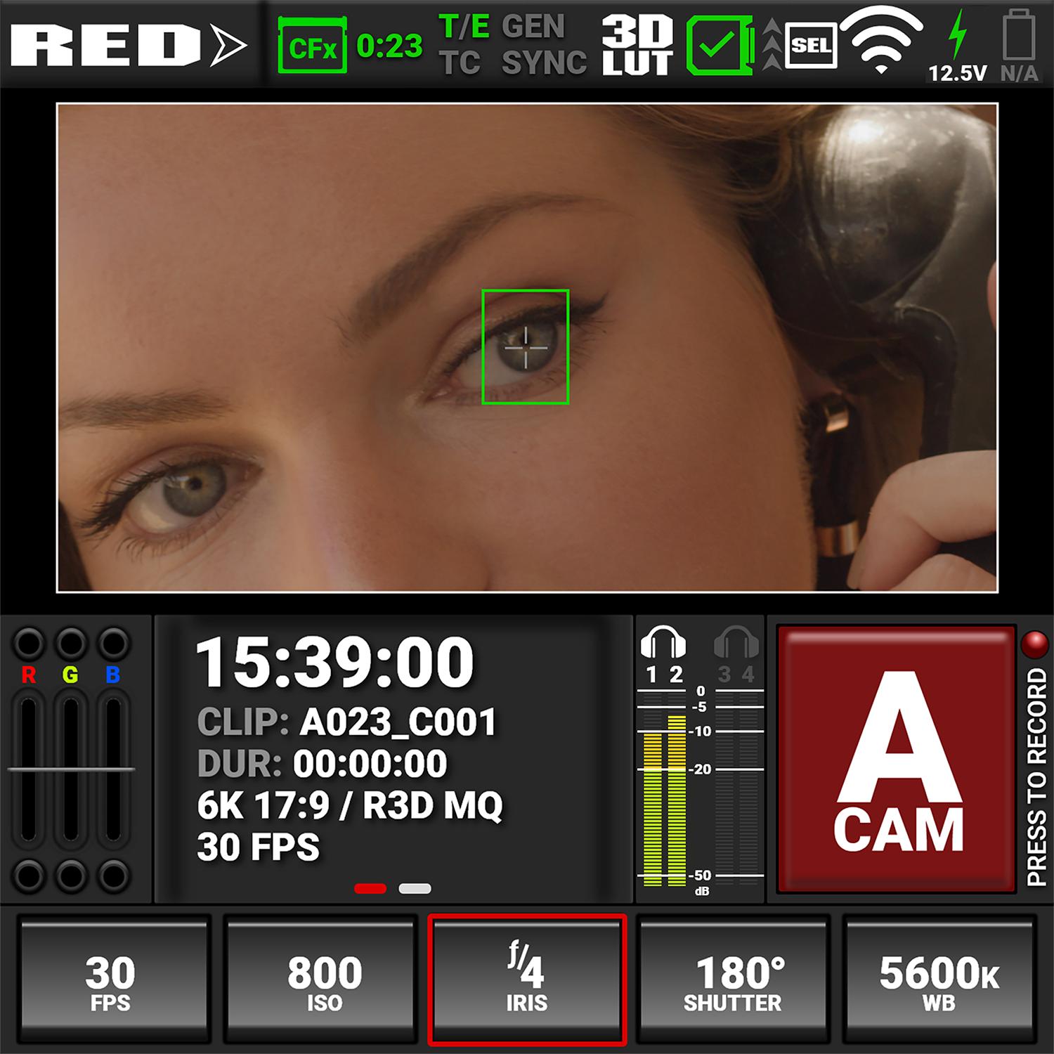 Preview, which displays the preview of the shot, RGB meter, Info/Histogram, VU meter, and REC button.