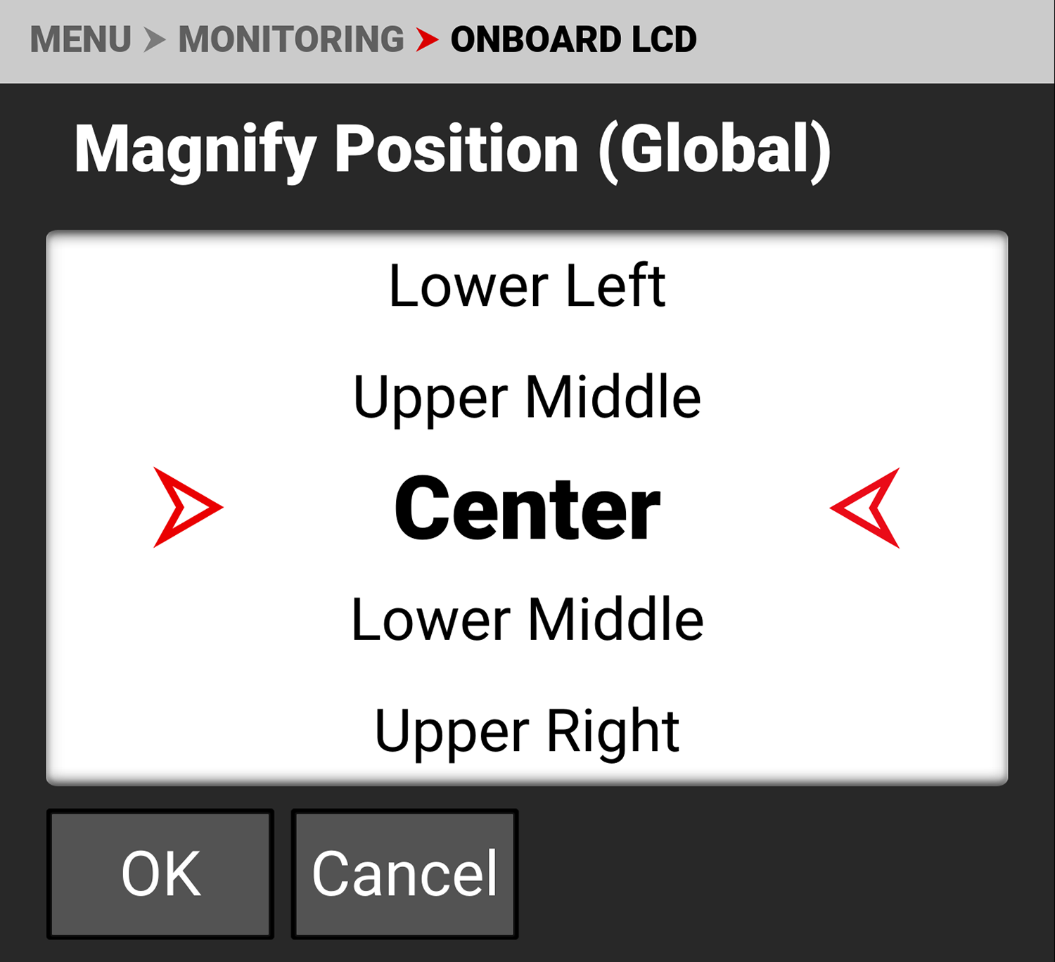Use Magnify Position (Global) to select the position of the magnified area for all LCD magnification (when Magnify LCDs is enabled).