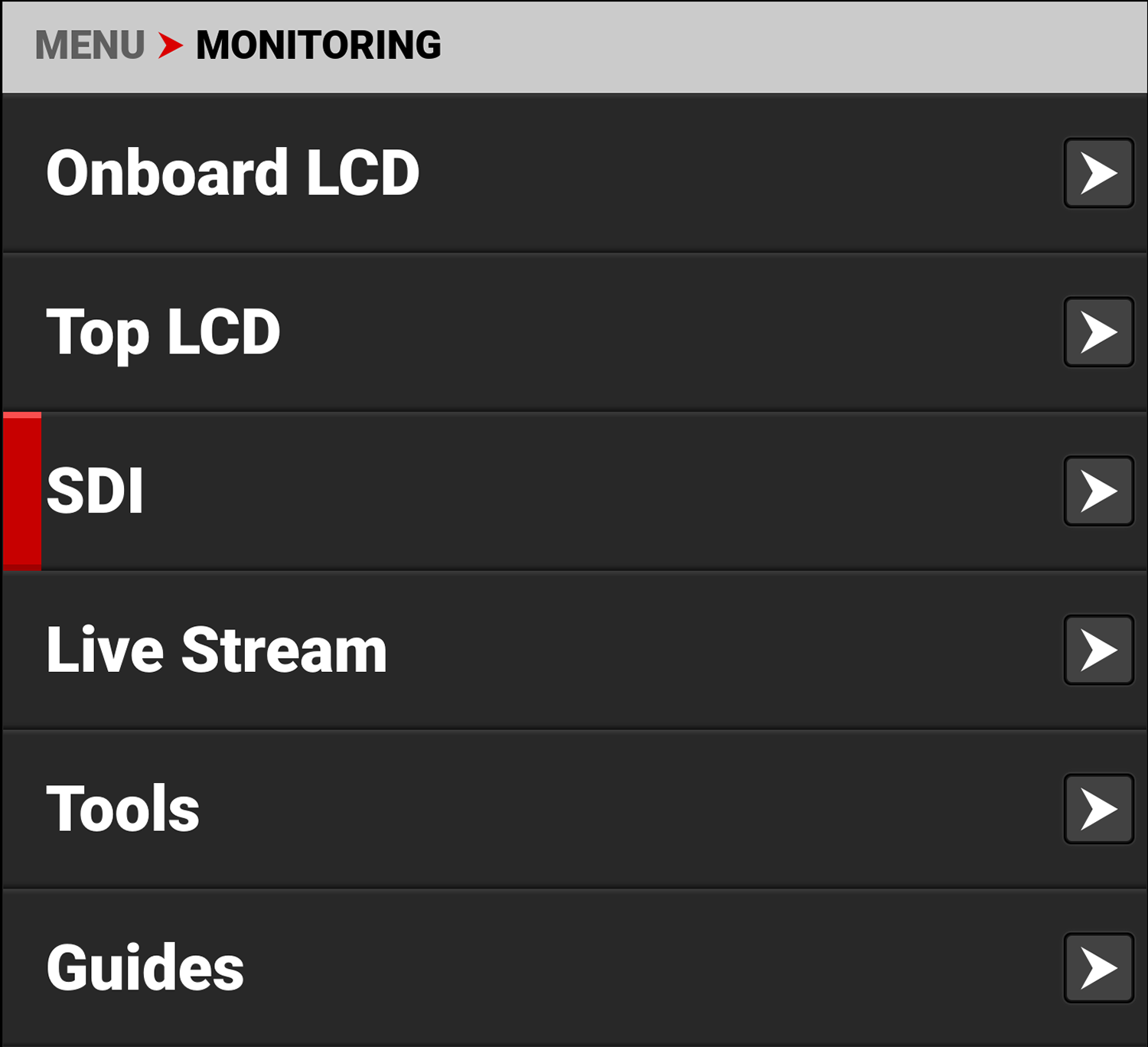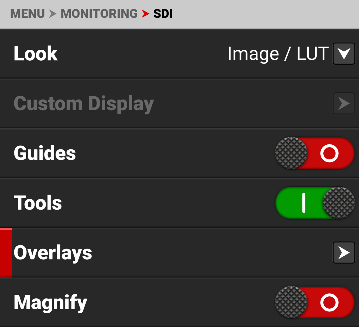 Use Tools to enable or disable (default) the viewing of SDI tools, and use of the SDI Overlay Function Top button (refer to Top Buttons Mode). Tap the switch to toggle between enabled and disabled.
