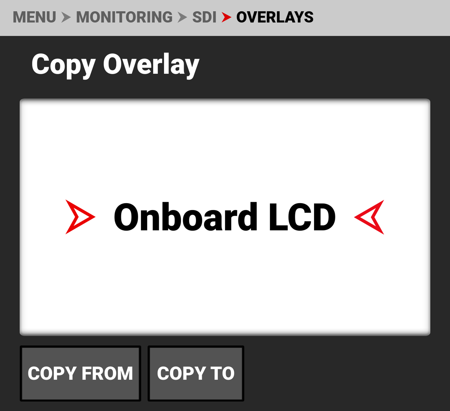 Use Copy Overlay to copy an overlay to or from the SDI from or to the Onboard LCD or Top EVF.