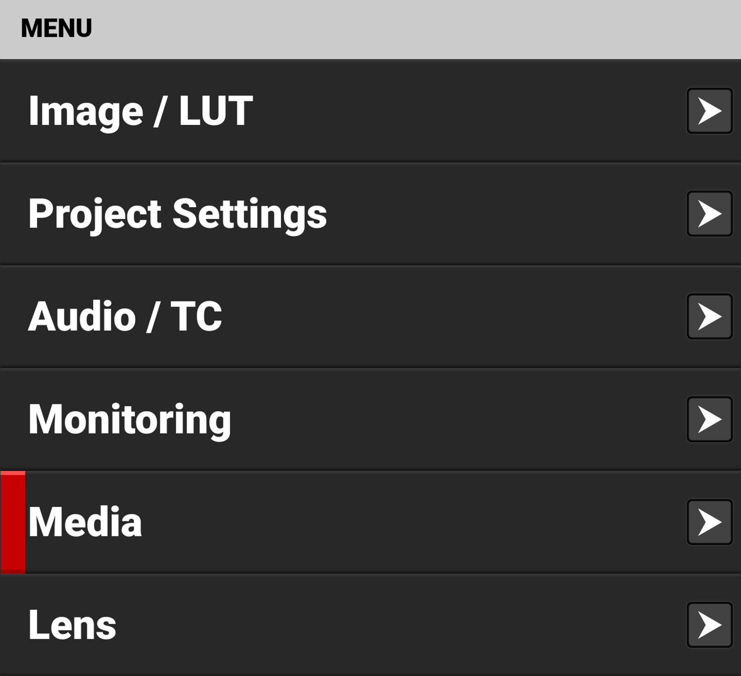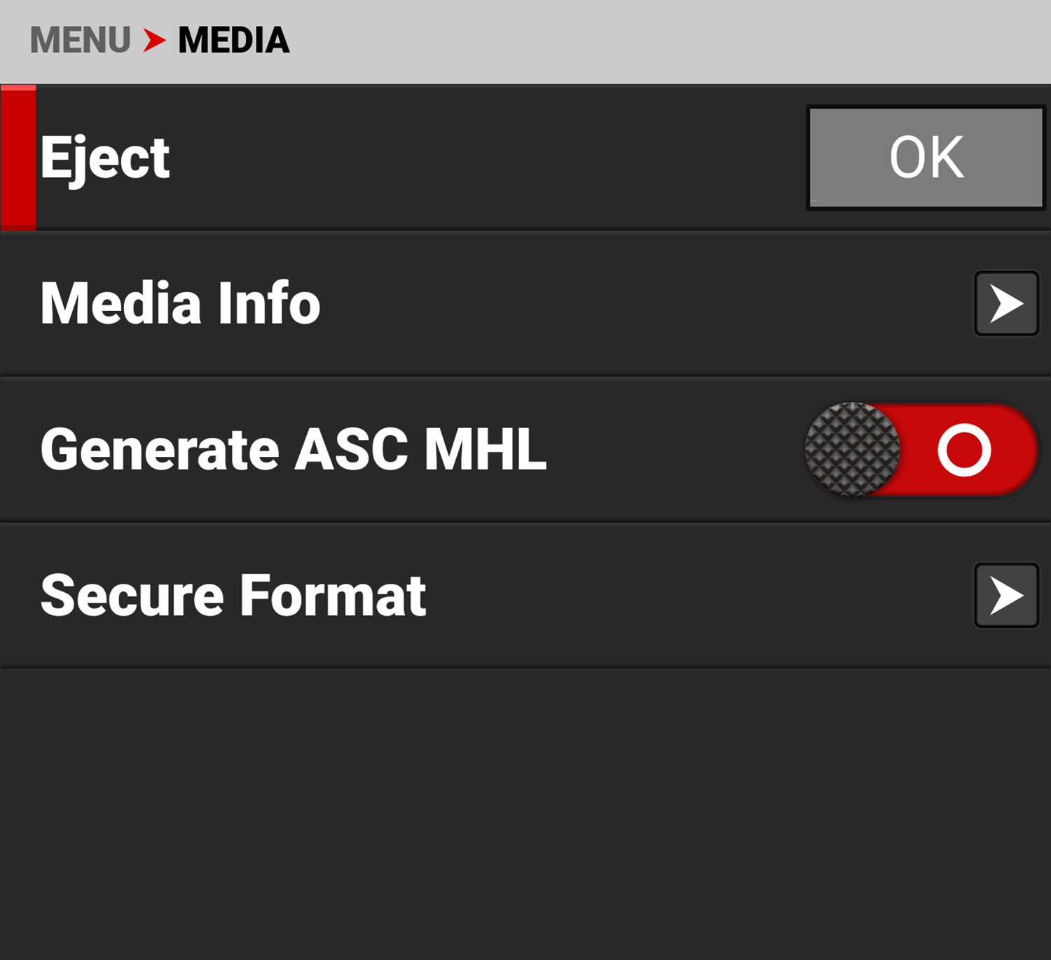 To eject (unmount) media from the camera, use the Onboard LCD Touchscreen and select Menu > Media.