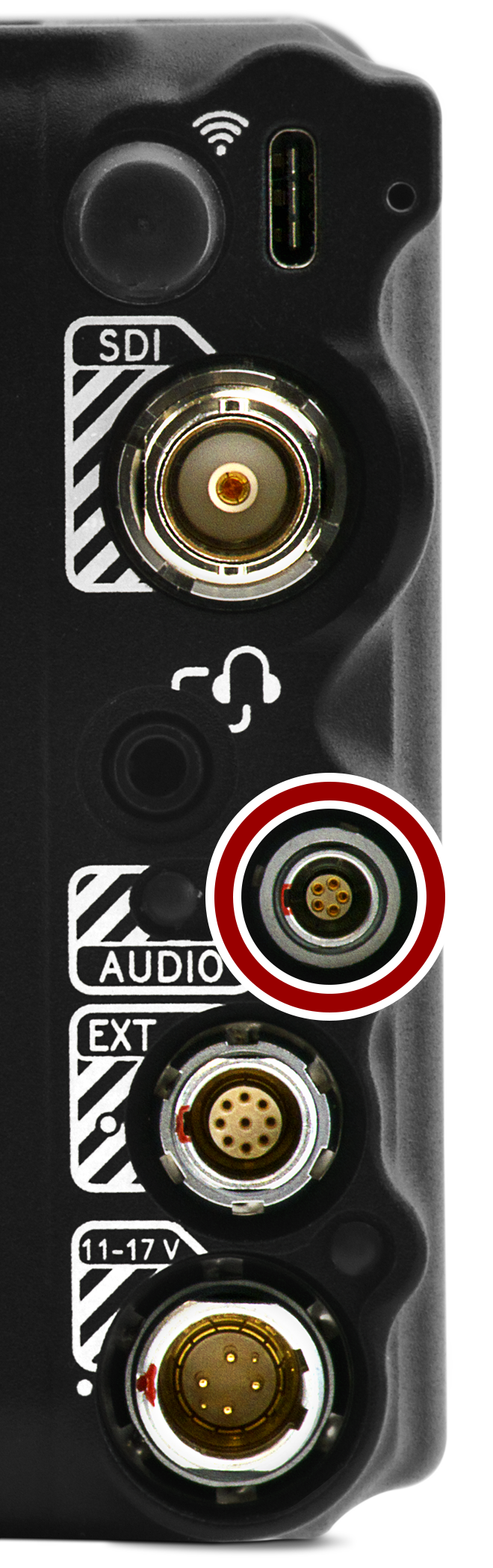 The female LEMO 5-Pin 00B audio connector accepts 2-channel audio, Line, Mic, and +48V Phantom Power.