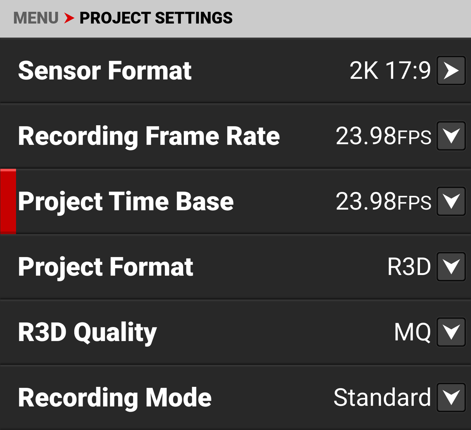 NOTE: When the Recording Frame Rate is set to a higher speed than the Project Time Base setting, audio is recorded as varispeed audio (refer to Audio / TC Menu).