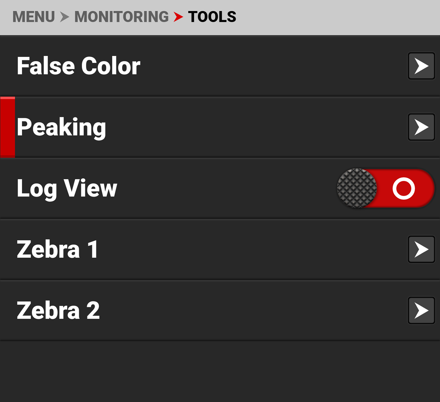 The Peaking tools display contrast, outlines, or colors to assist with focusing.