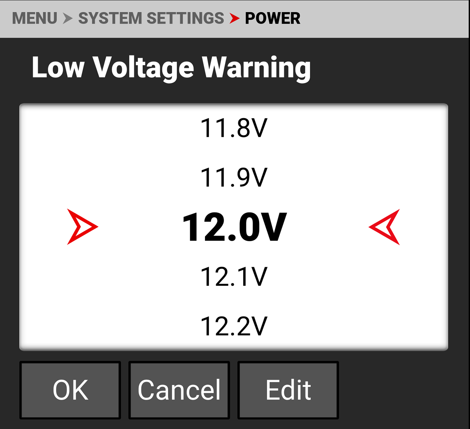Use Low Voltage Warning to set the desired voltage level to trigger the low voltage warning. The warning displays on the LCD and across Overlay Modes that contain power status (refer to the Status Bar section for more information about the status icons).
