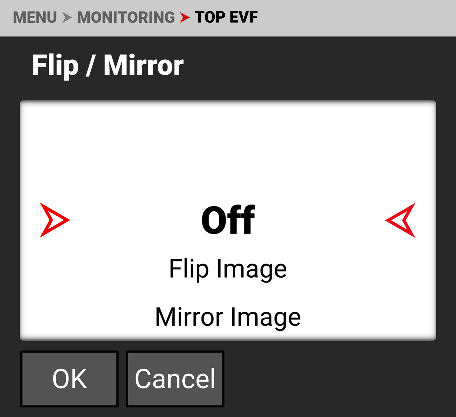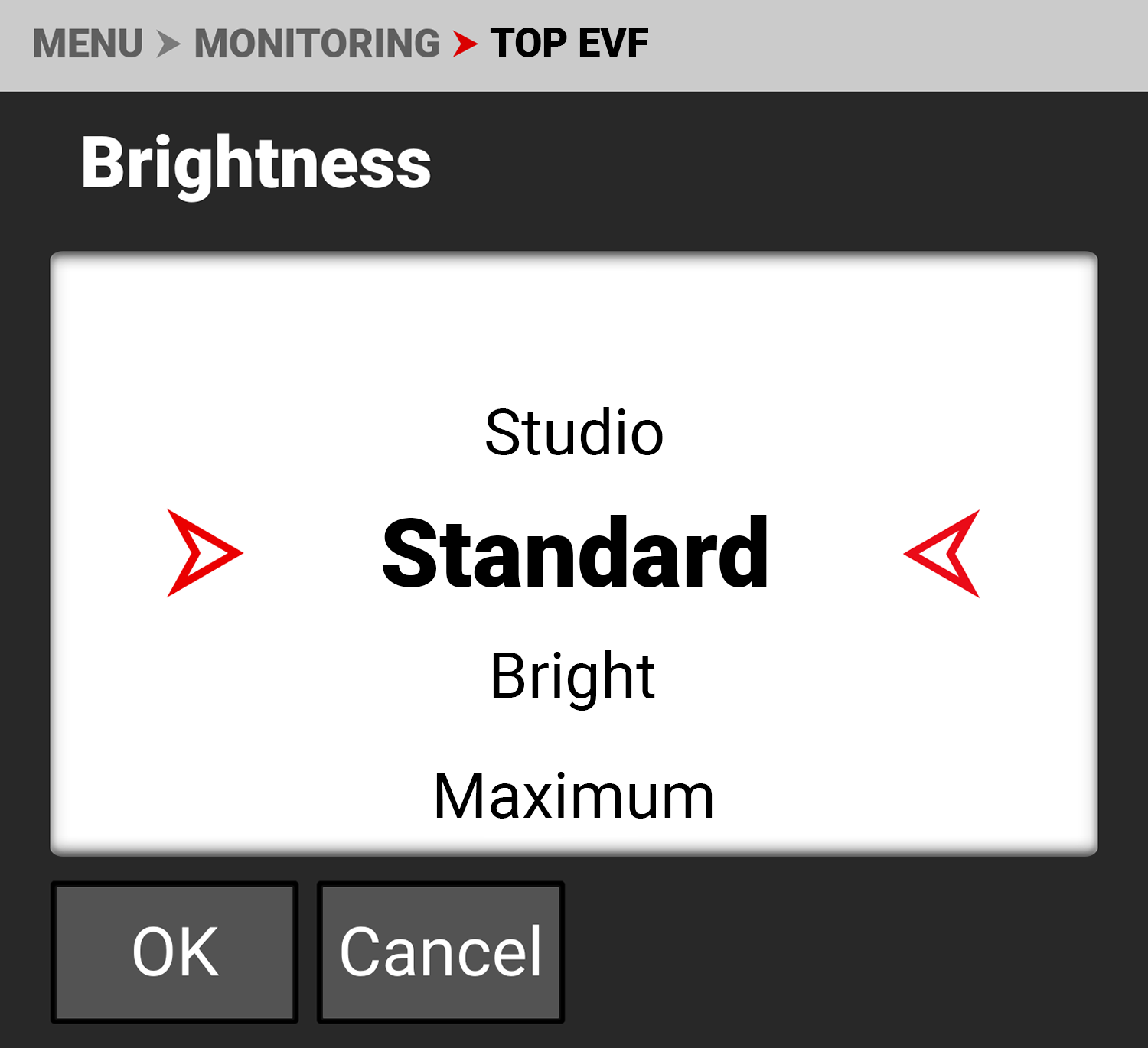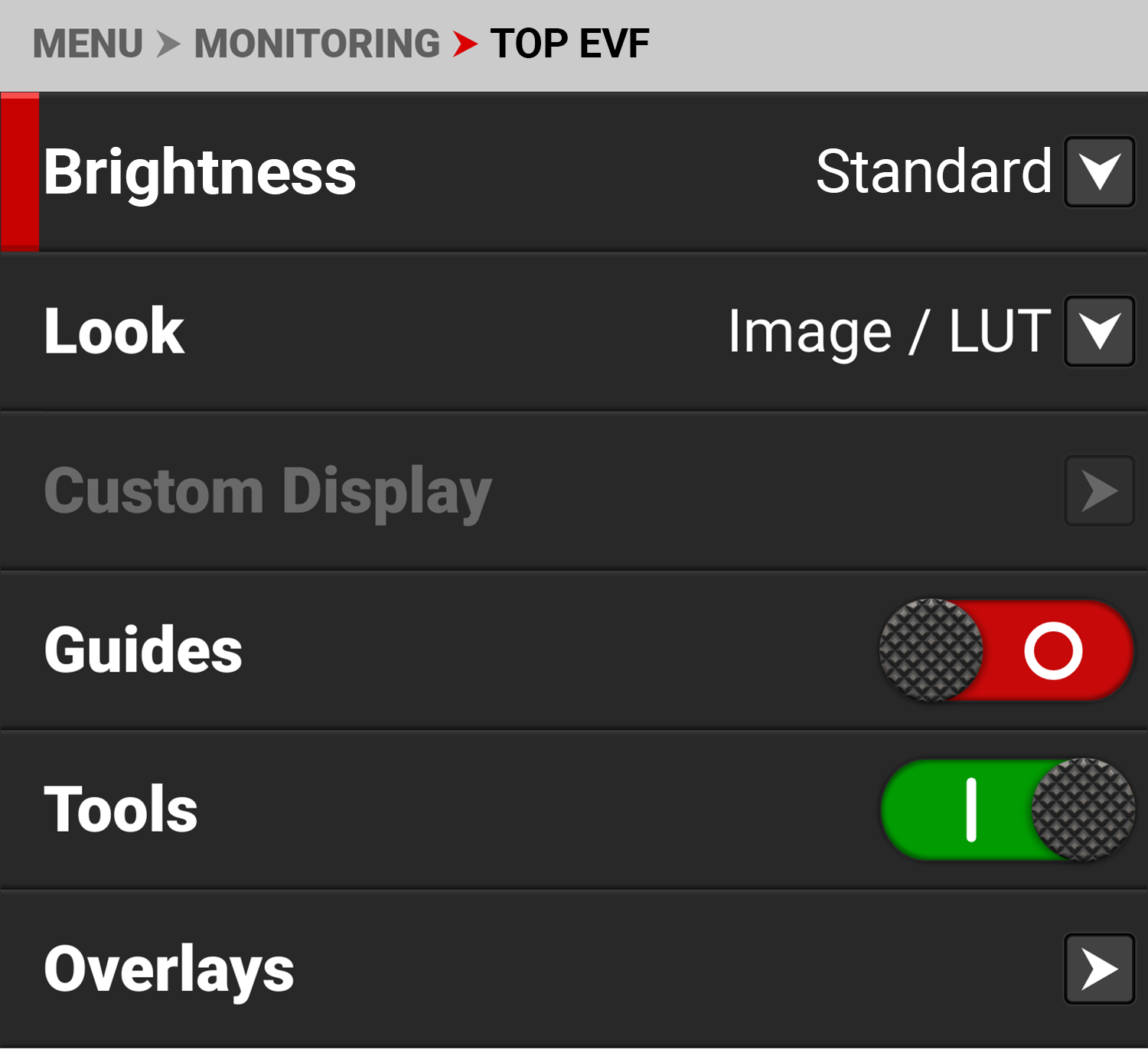You can select the brightness of the Top EVF display. RED recommends that you select the brightness which best fits your environment to reduce your eye's transition time to and from the EVF.