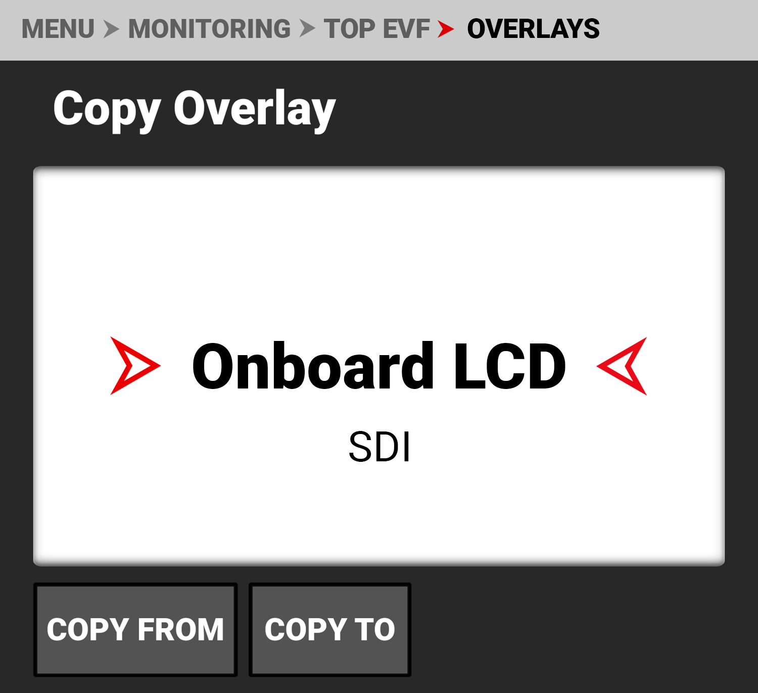 Use Copy Overlay to copy an overlay from or to the Onboard LCD or SDI, to or from the Top EVF.