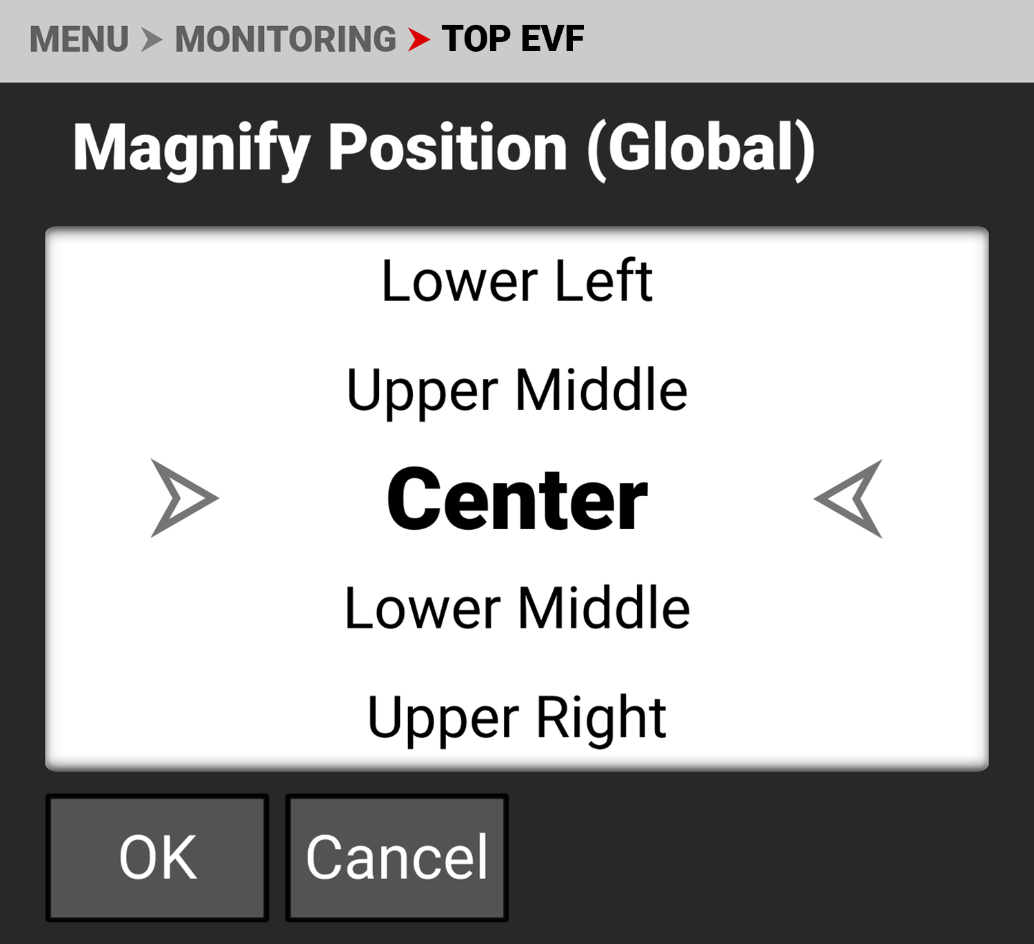 Use Magnify to enable or disable EVF magnification. Press SEL to toggle between enabled and disabled (default).