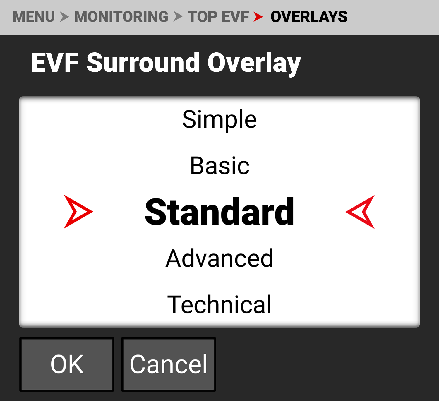 The EVF Surround types include: None, Simple, Basic, Standard, Advanced, and Technical (refer to SDI for more information about Surround Overlays).