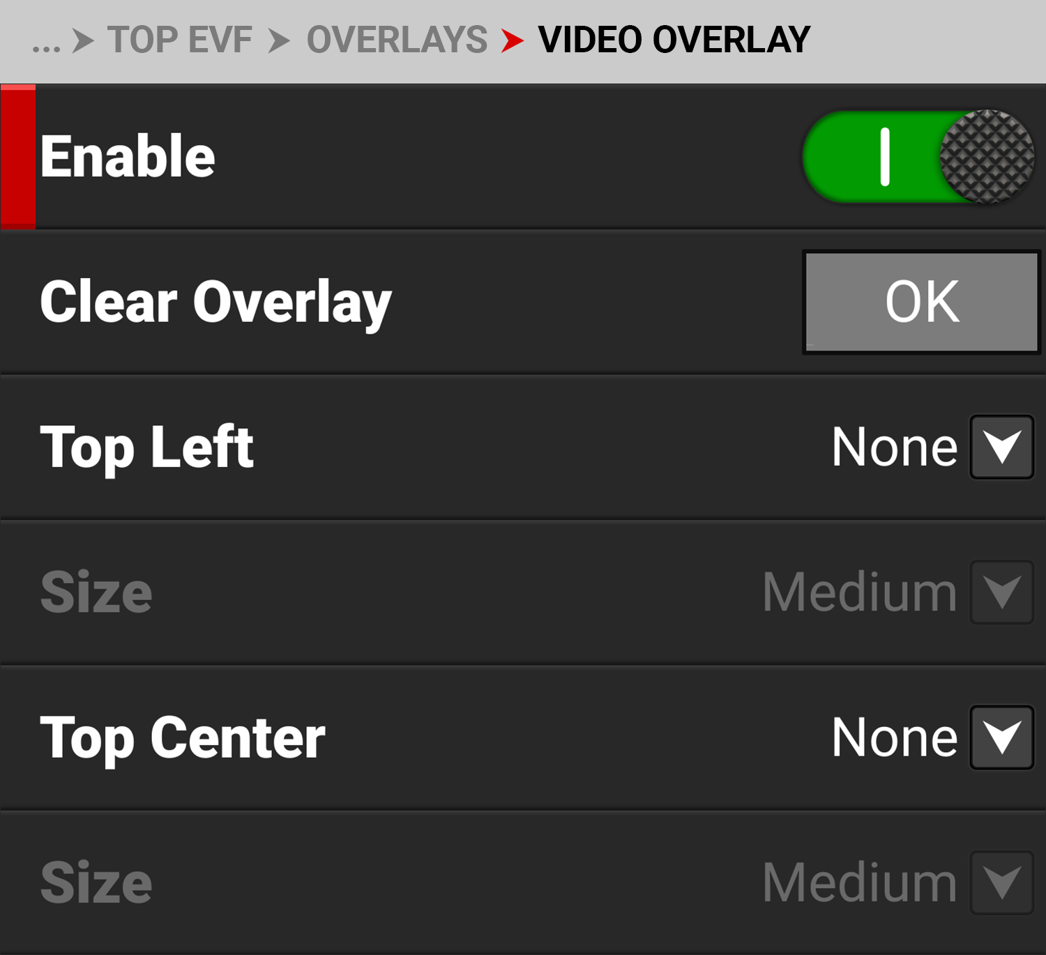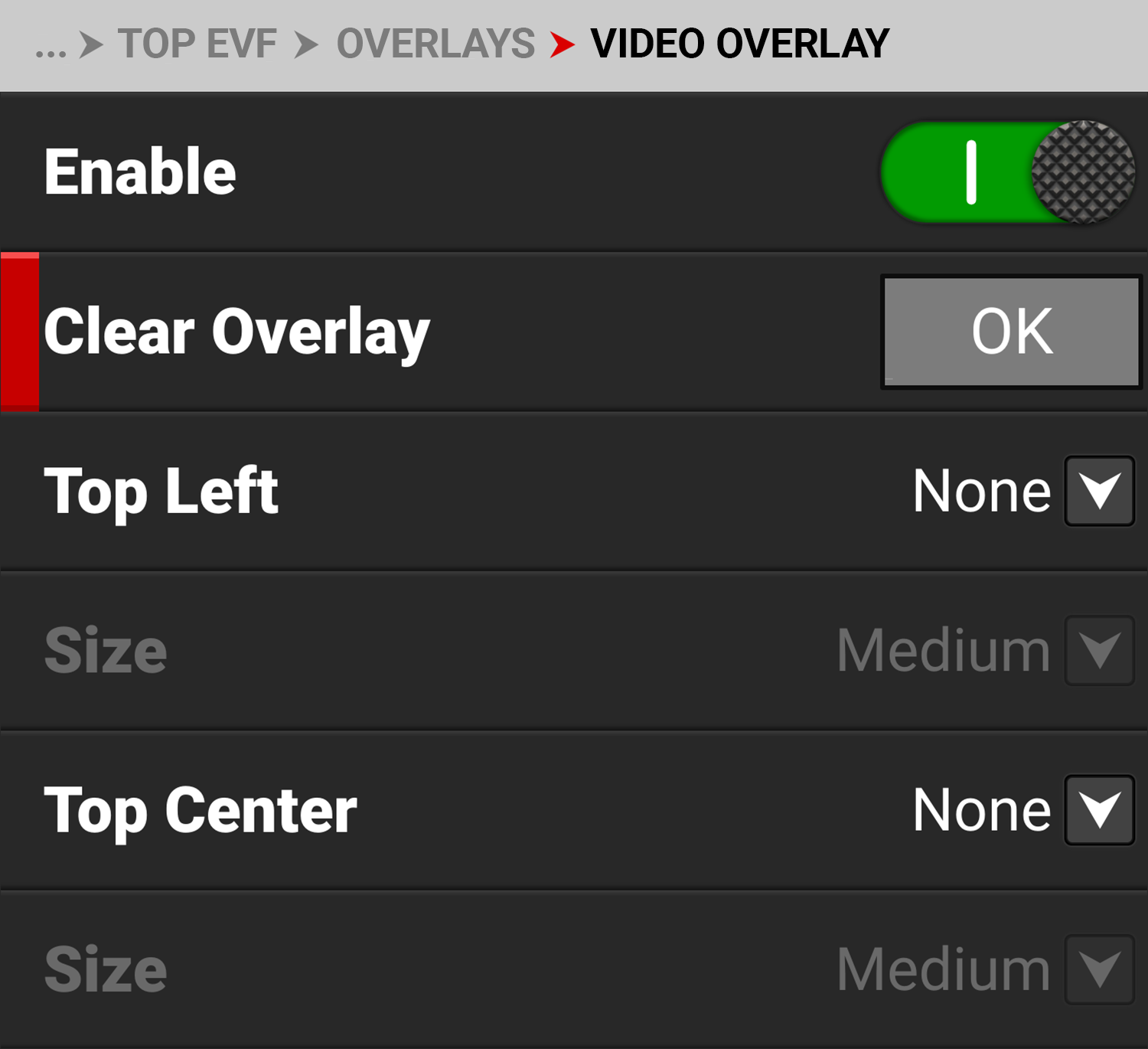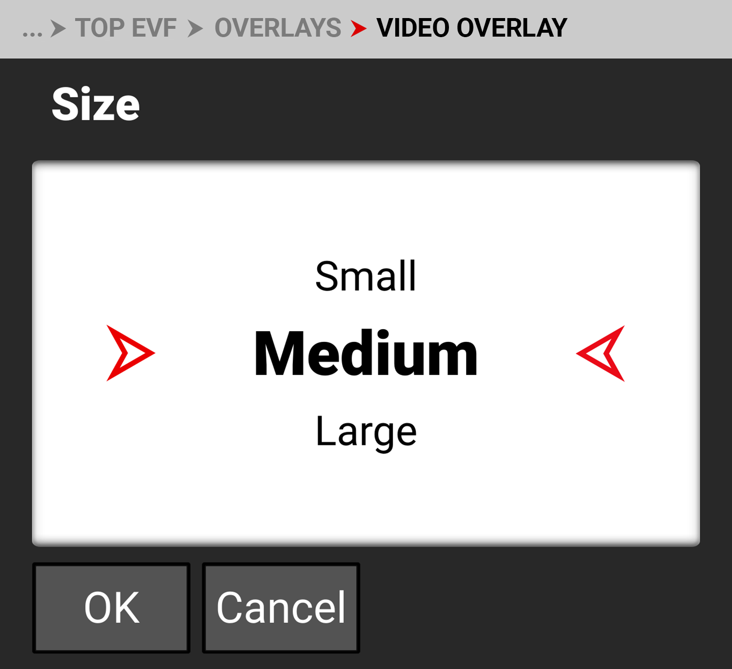 Select the size for the EVF video overlay values |