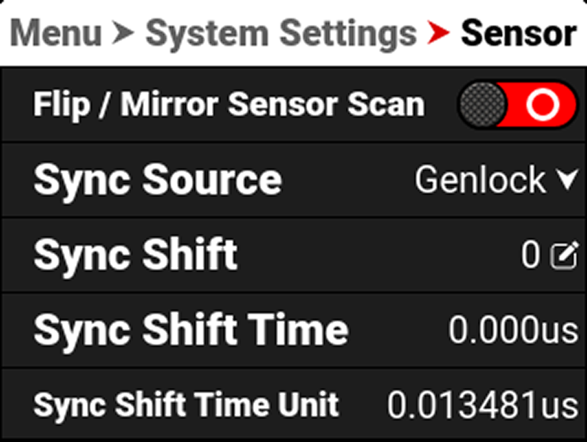 Use Sensor to flip / mirror the sensor scan, to select the sync signal source, and to shift the sync signal.