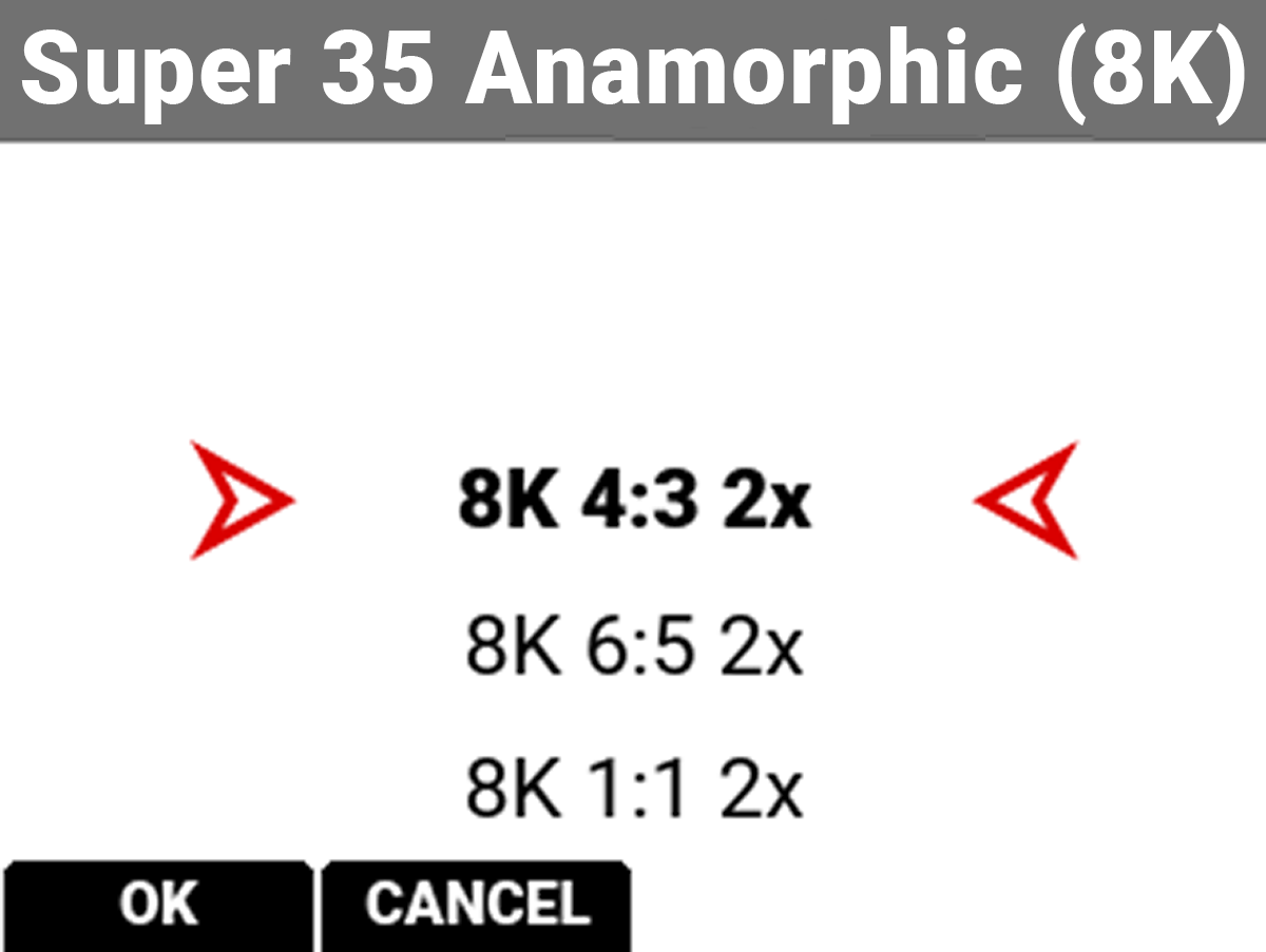 Use the Super 35 Anamorphic (8K) sensor format setting to designate how much of the sensor the camera should use to capture anamorphic images with the appropriate de-squeeze ratio.
