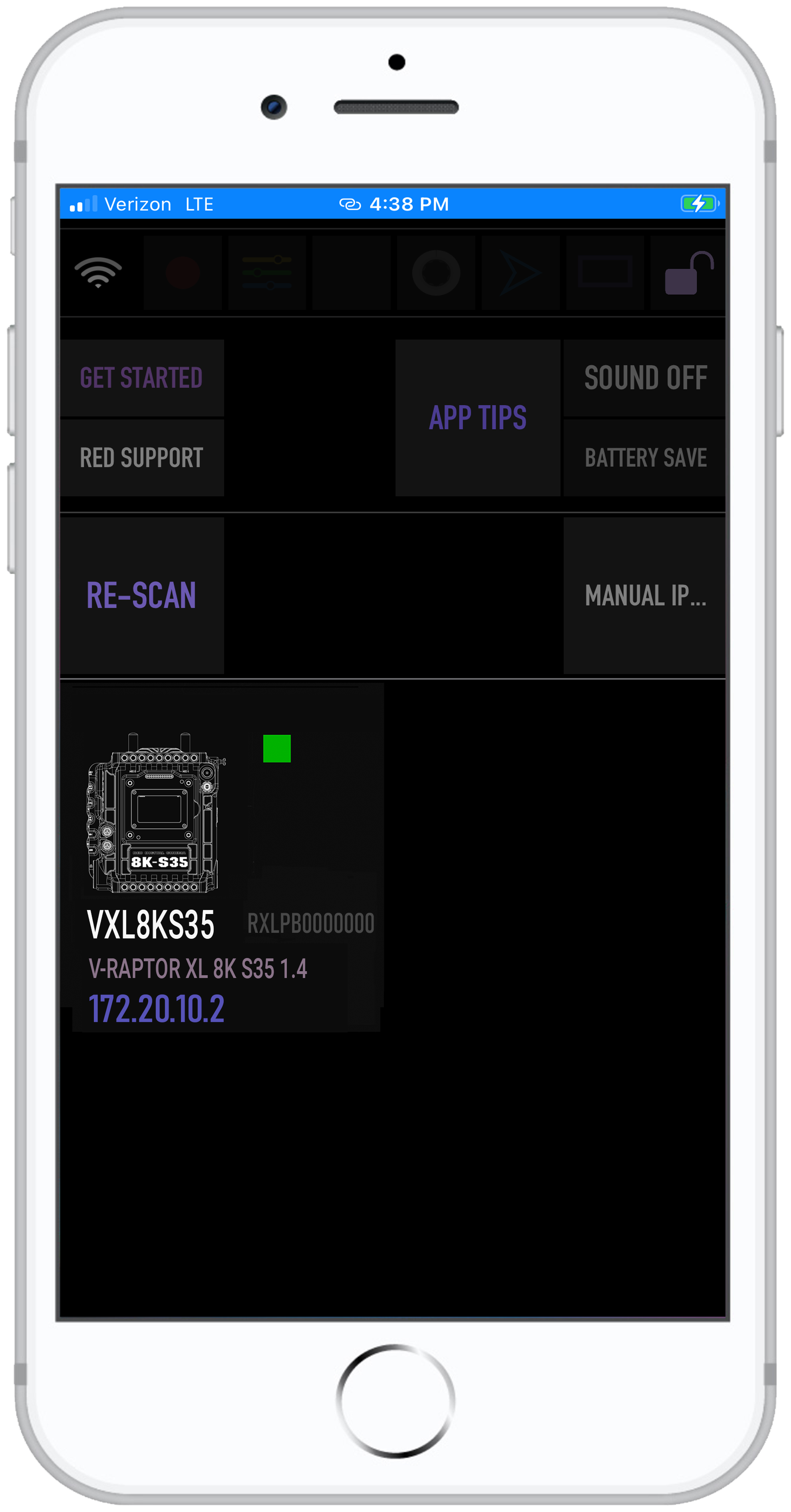 1. Tap the camera icon to open the RED Control app tools for the networked camera.