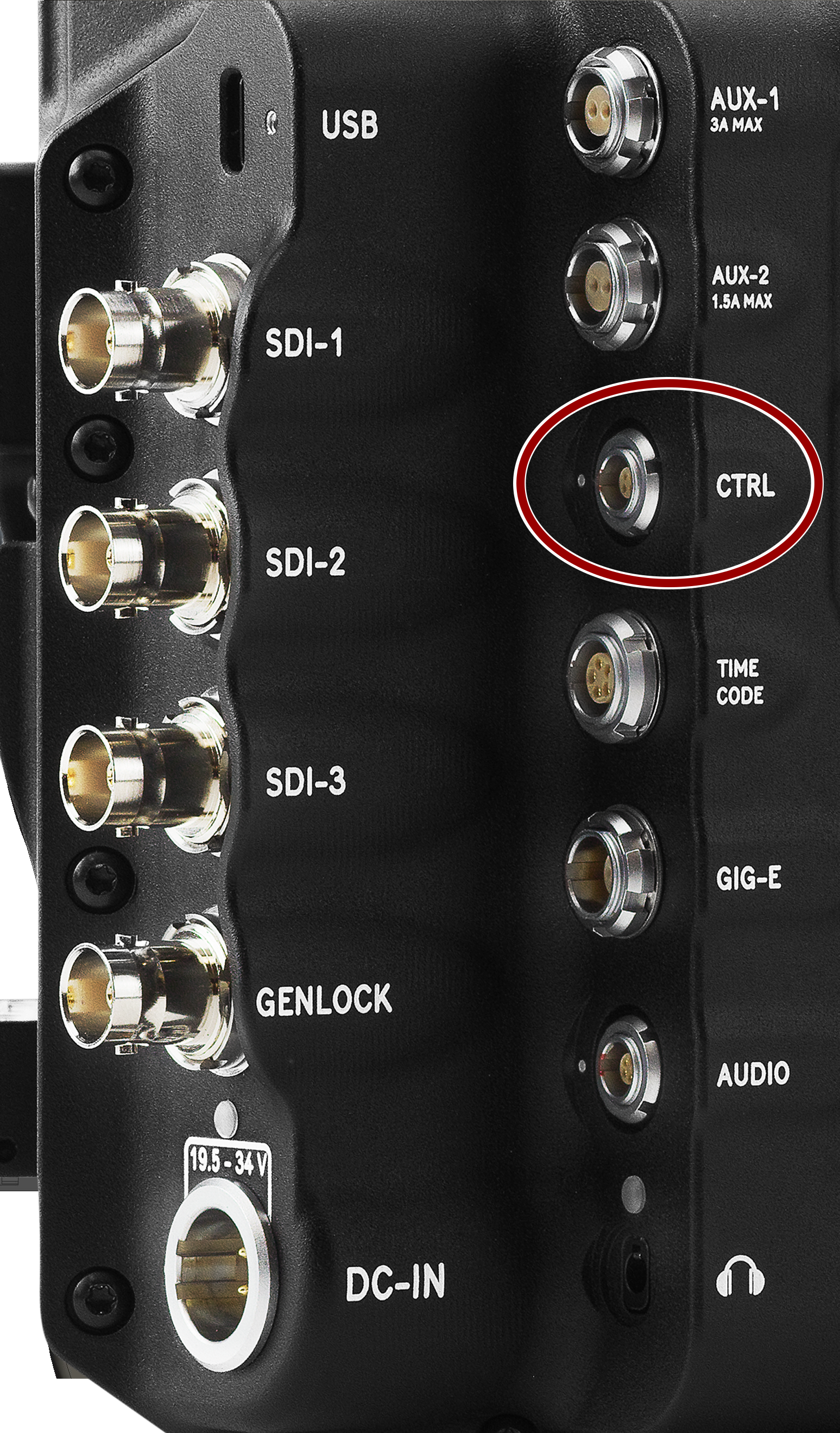 The female LEMO 4-Pin 00B CTRL connector supports RS-232 remote control for 3D camera communication and third-party metadata ingest applications.