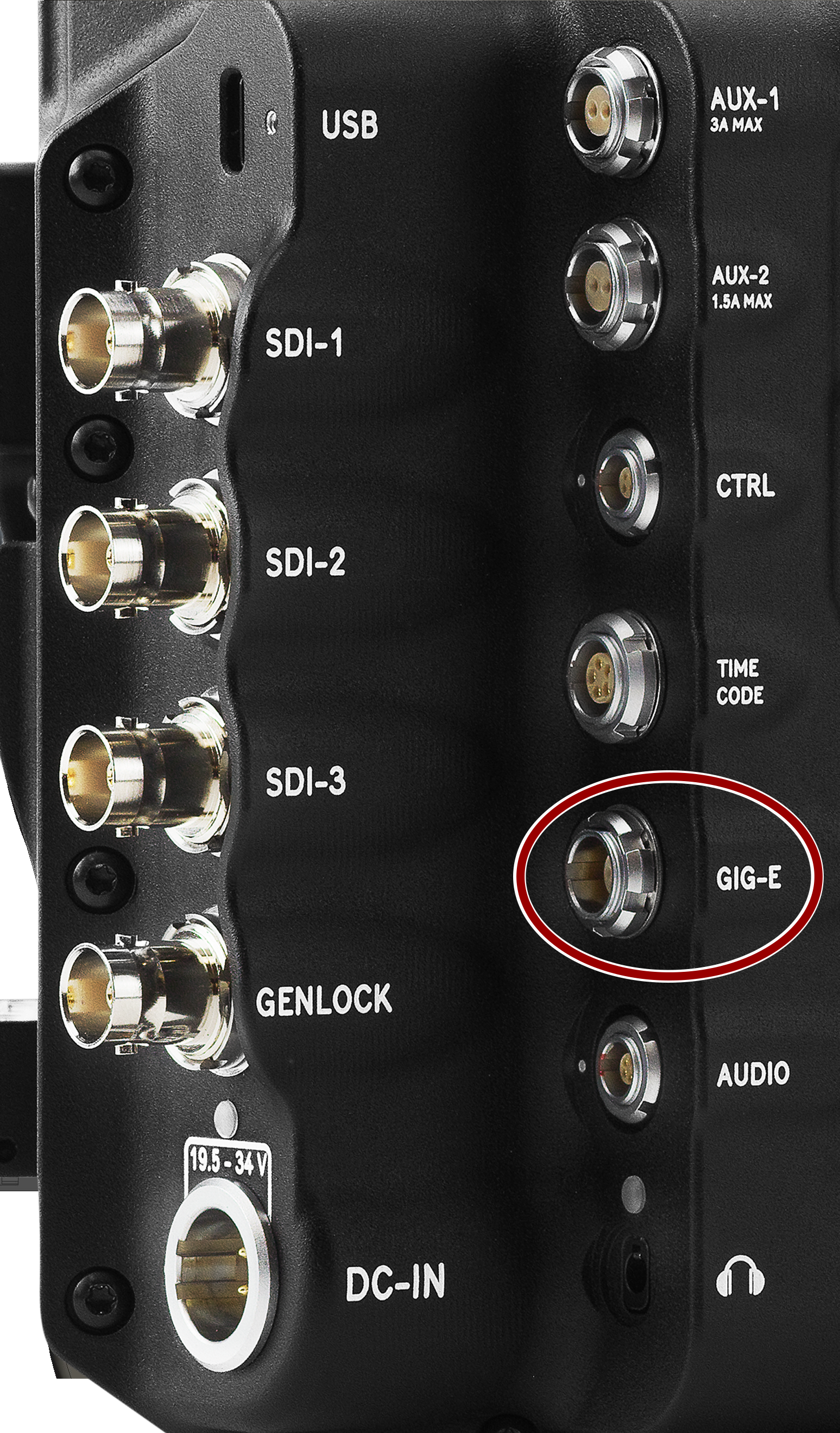 The GIG-E ODU 9-Pin 0L connector provides a 1000BASE-T (IEEE 802.3ab) Gigabit Ethernet connection remote camera control, Precision Time Protocol (SMPTE 2059-1) sensor and frame synchronization, and accessing the 1080p IP video stream.