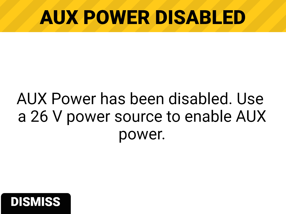 When a 14 V battery is mounted, a message displays on the Side LCD and Top LCD Monitor indicating that AUX power is disabled: