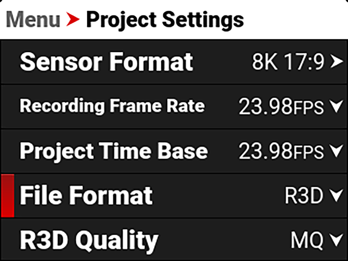- You can select a Sensor Format from the Project Settings Menu and the camera will scale it to the target resolution you select in ProRes Resolution.