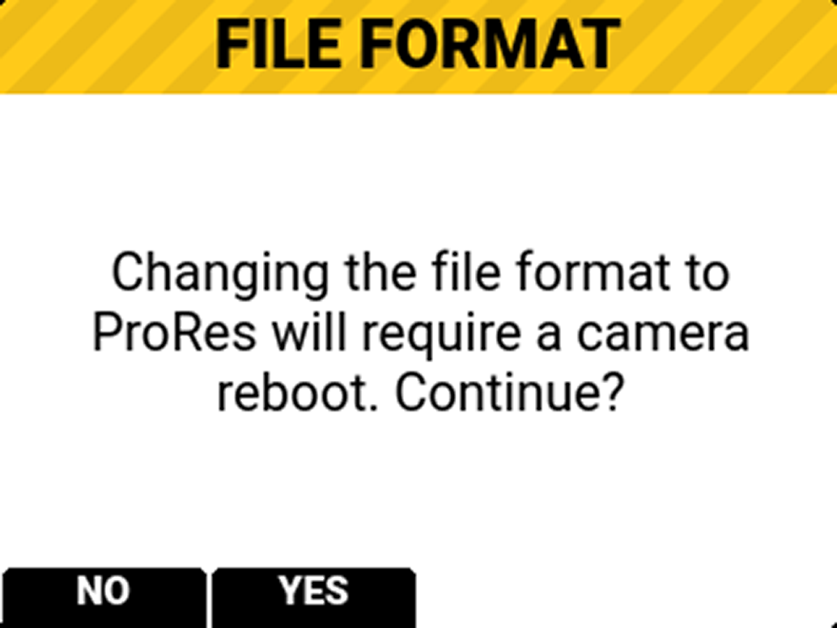 When you change the file format, a message warns you that the camera must be rebooted to complete the change: