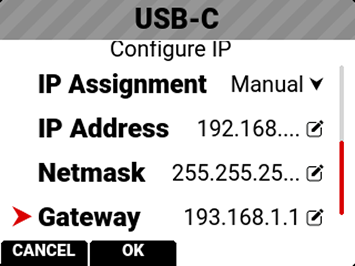 When Manual IP Assignment is enabled, you can select Gateway and manually enter a Gateway (router) address.