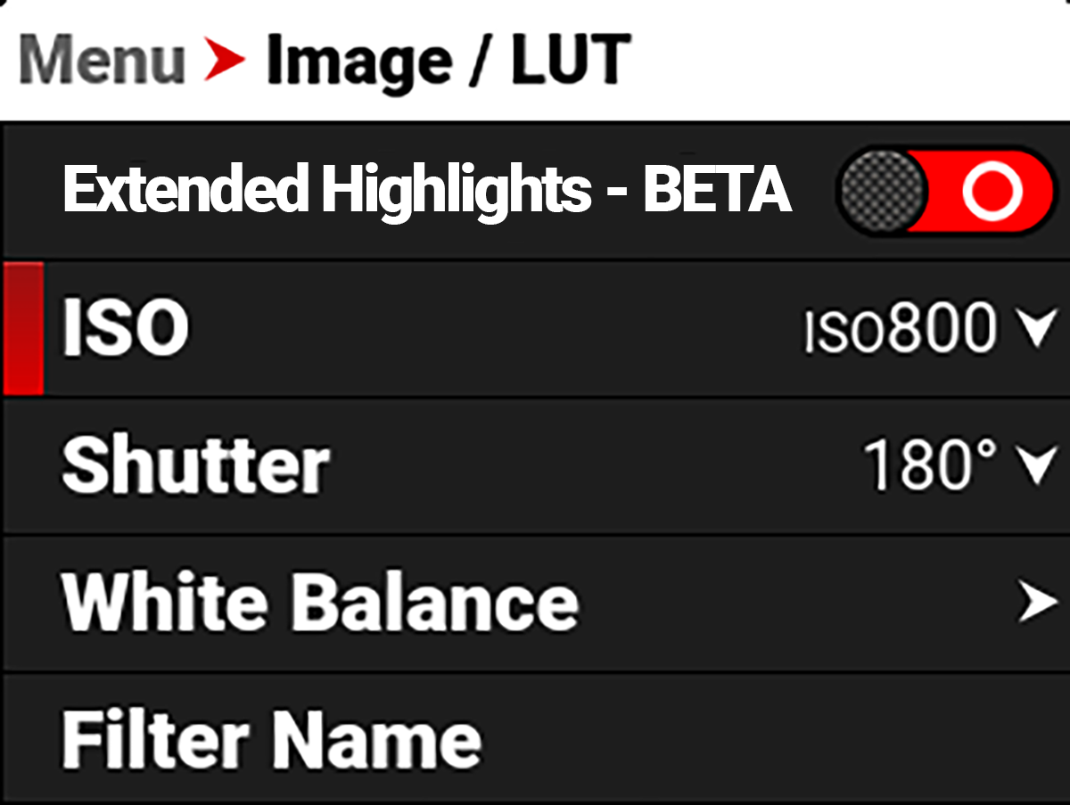 When the Extended Highlights - BETA feature is enabled, the camera displays "EH" next to the ISO value to remind you of the increased dynamic range when deciding your exposure (refer to Extended Highlights - BETA).