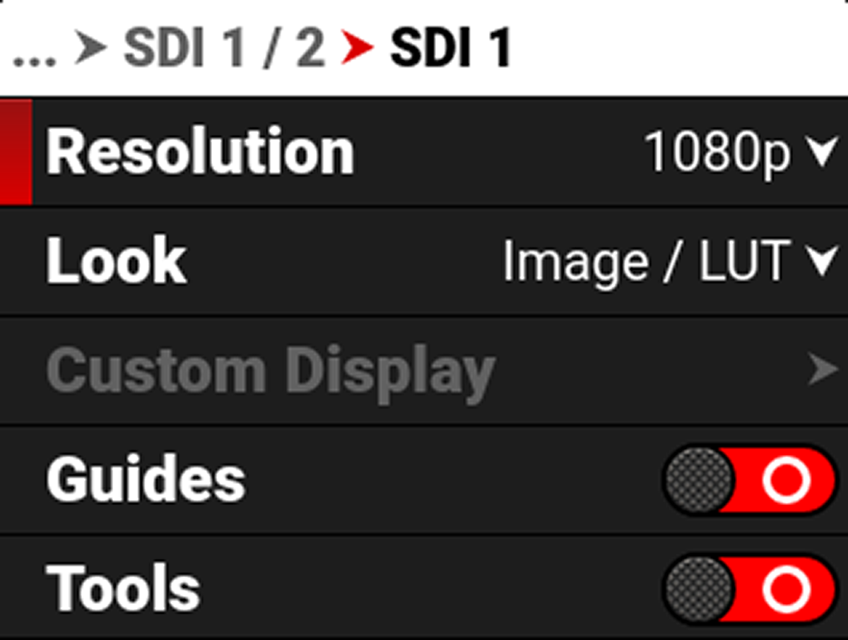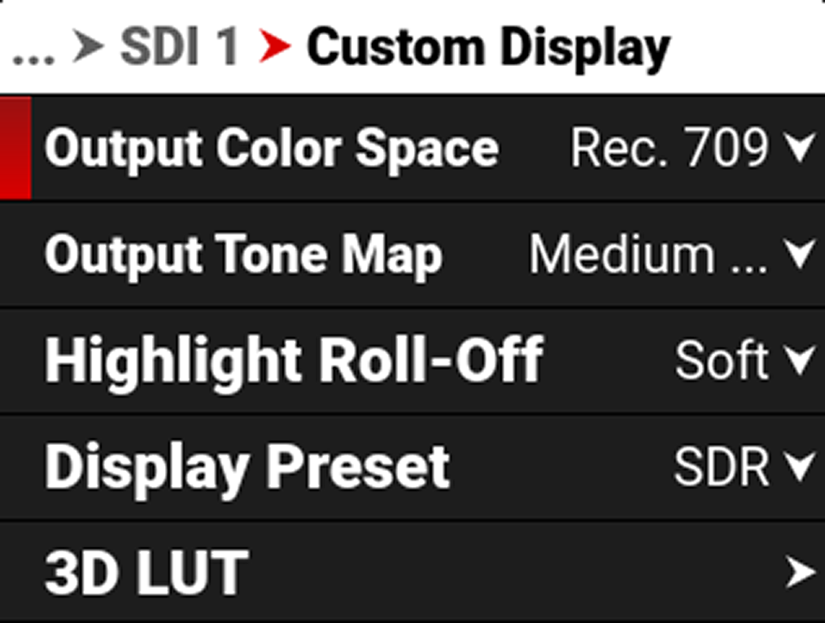 Use Custom Display to configure the SDI independently of the camera's Image / LUT settings or other monitor output configurations.