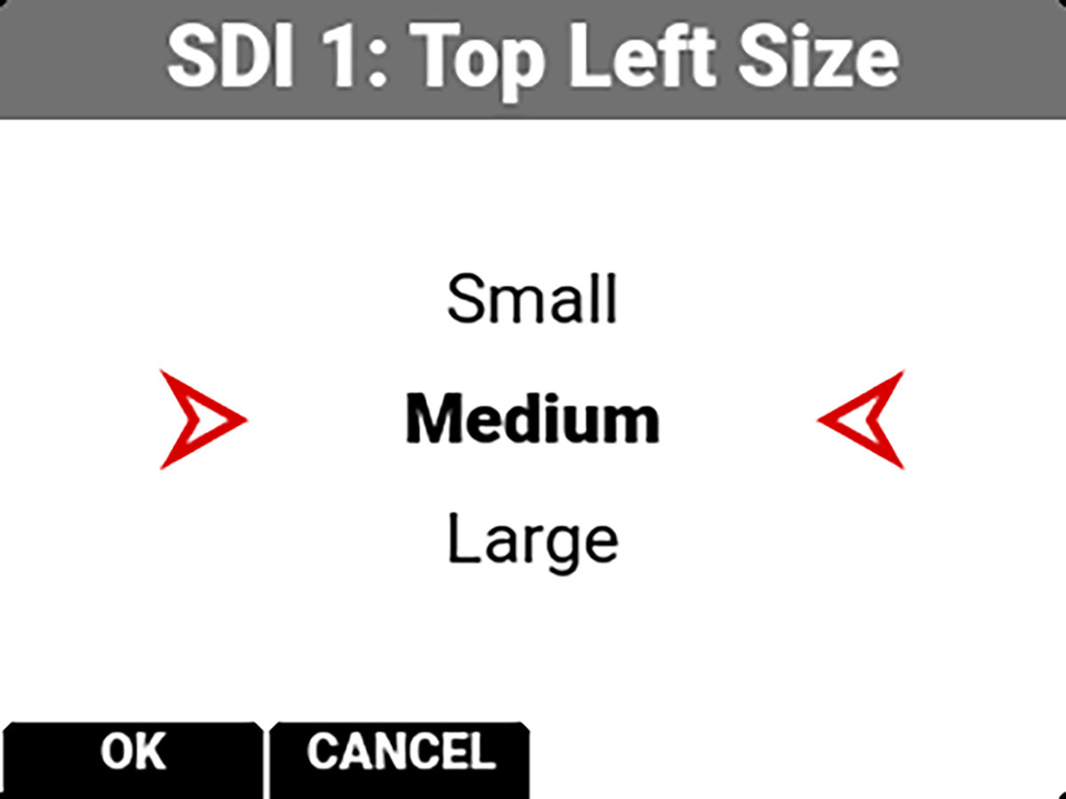 Use Size to select the size of the displayed values on the SDI video overlay.
