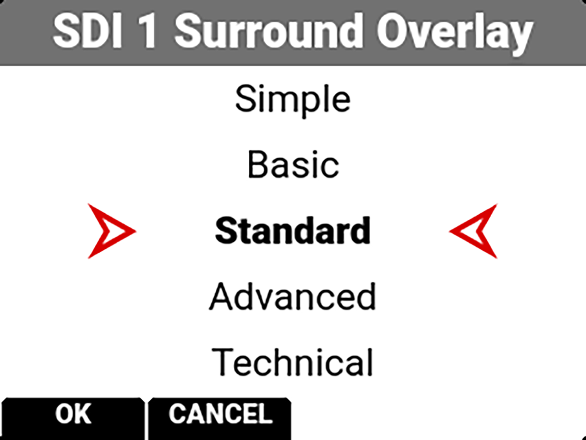 Use SDI Surround Overlay to select the overlay surround type you want to use for the SDI display. You can select one of the following SDI port overlay modes: