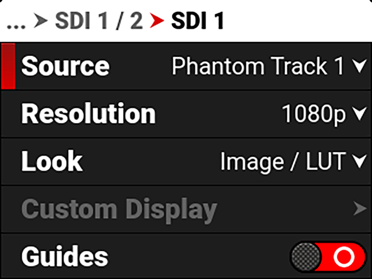 When you enable Phantom Track Recording mode in the Project Settings menu, the Source option is added to the SDI menu. You can use the Source option to select which Phantom track you want to display on the selected SDI port.