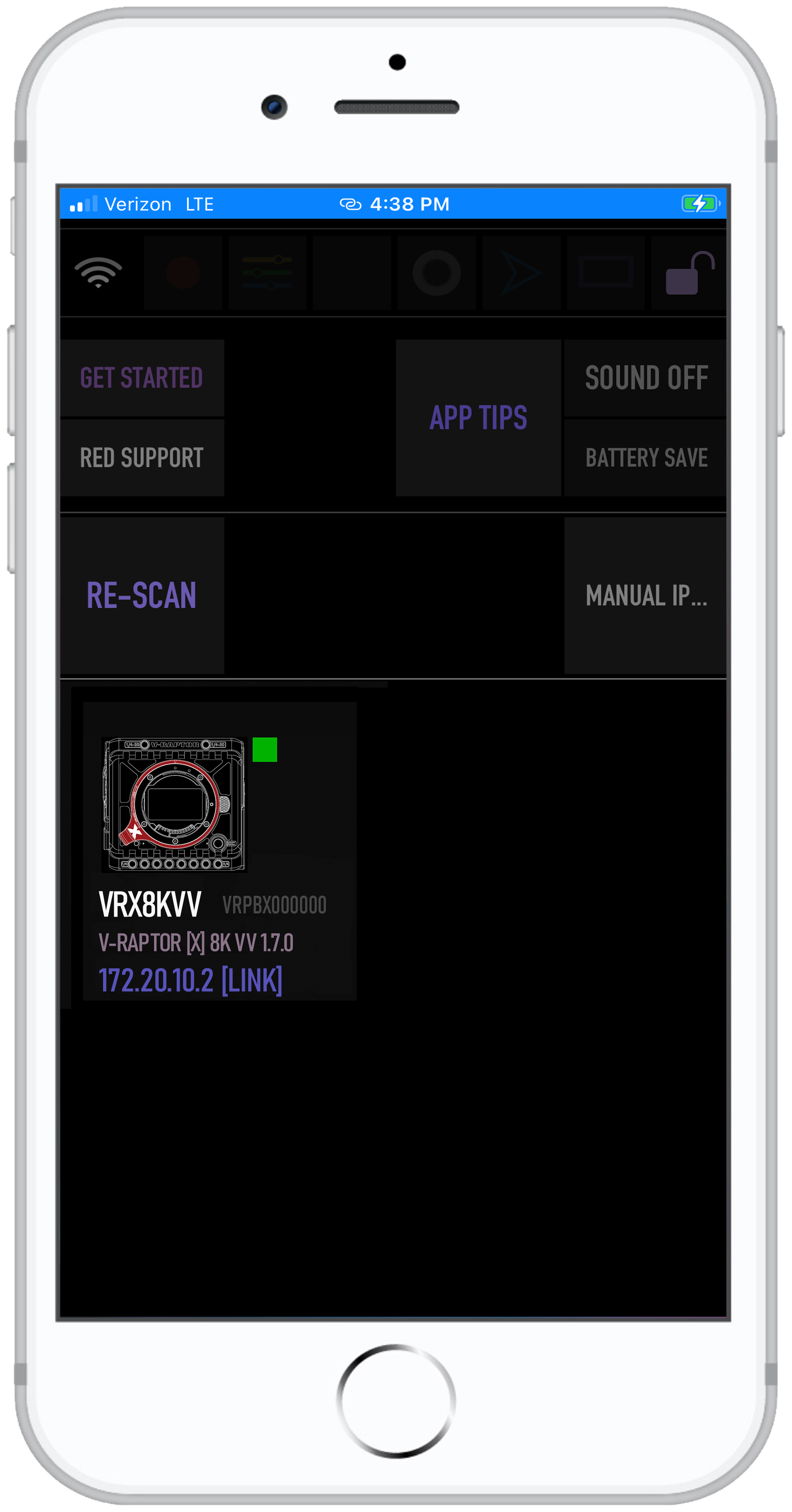 1. Tap the camera icon to open the RED Control app tools for the networked camera.