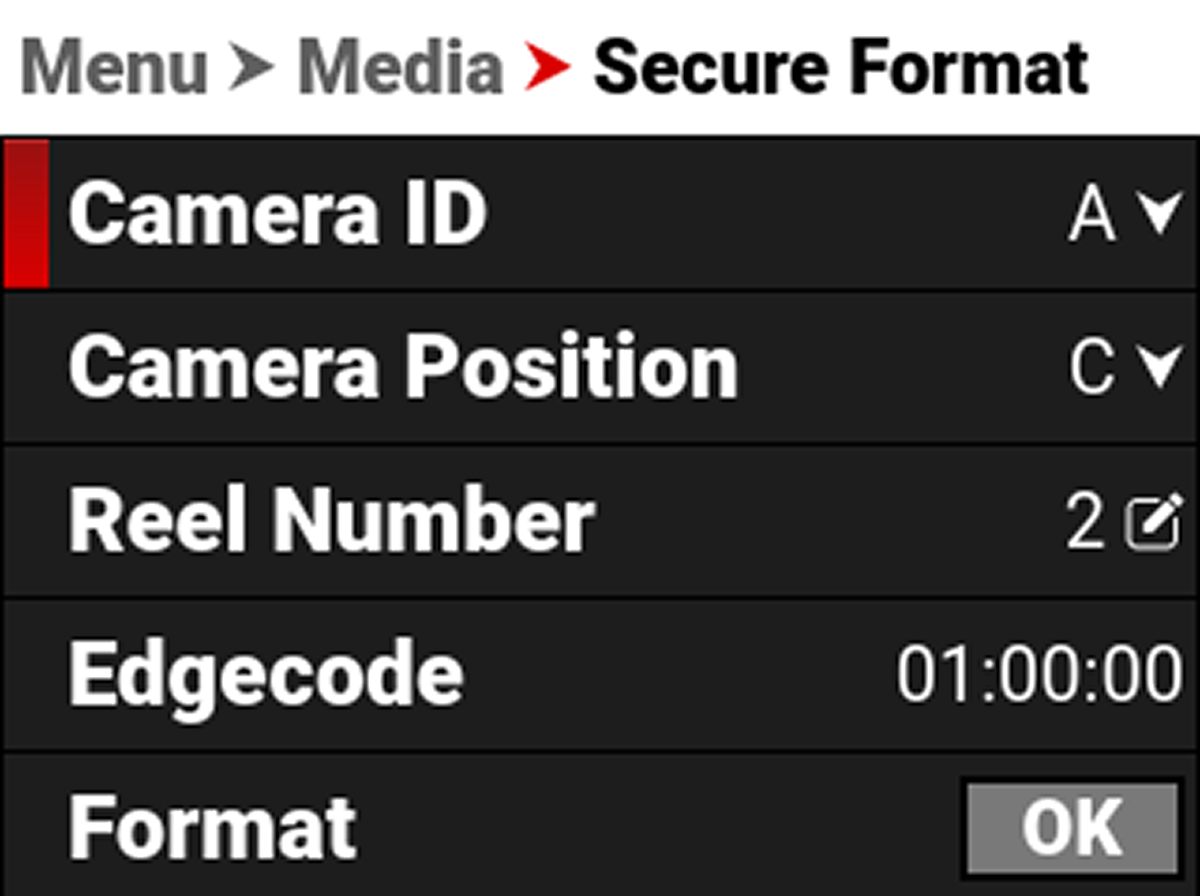 - From the Secure Format menu, select the desired Camera ID, Camera Position, Reel Number and Edgecode. Navigate down to the Format button and press SEL to start the Secure Format process: