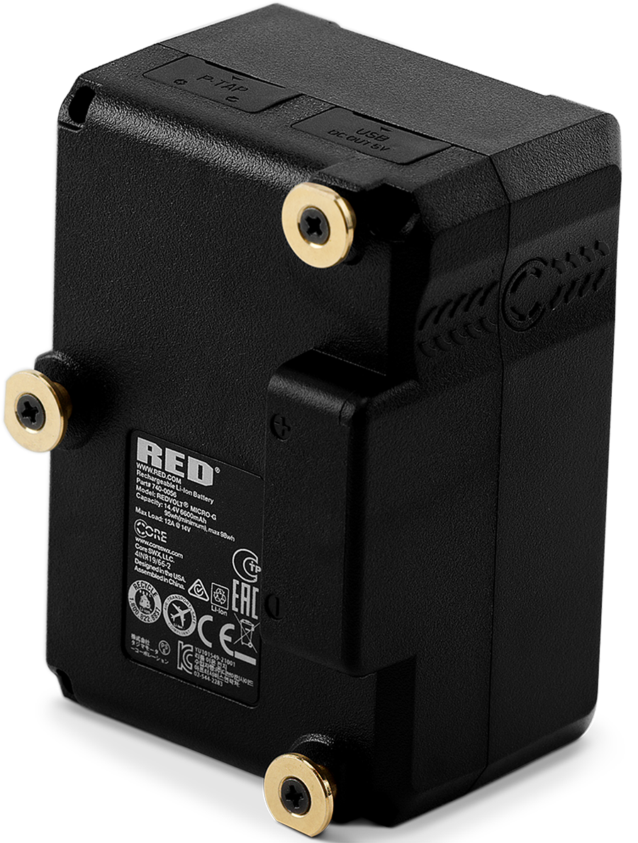 The REDVOLT Micro-G 14.7 volt Gold Mount battery includes an LED charge level indicator, a P-tap port, and a USB power port. V-RAPTOR requires the V-RAPTOR® Tactical Top Plate and Gold Mount Battery Adapter to allow you to use Gold Mount batteries (refer to V-RAPTOR® Tactical Top Plate and Battery Adapter (V-Lock or Gold Mount) for more information).