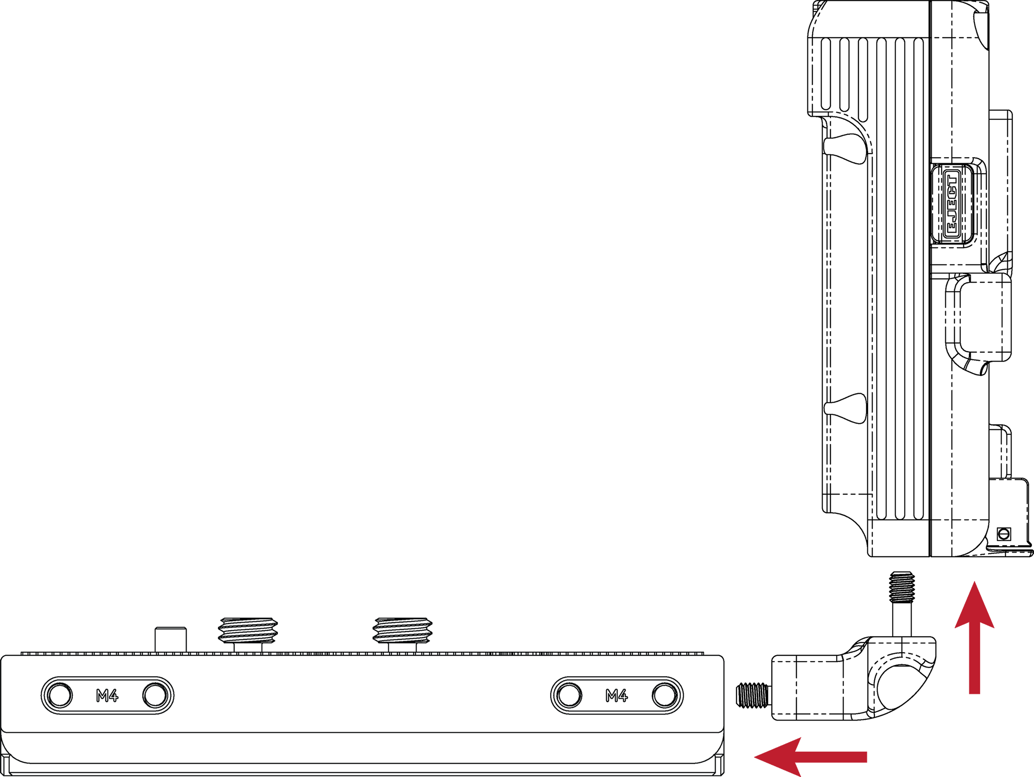 - Align the four screws with corresponding ¼-20 holes behind the POGO connection point on the top of the camera and tighten down each screw following a cross shape pattern to ensure even distribution of pressure on the plate.