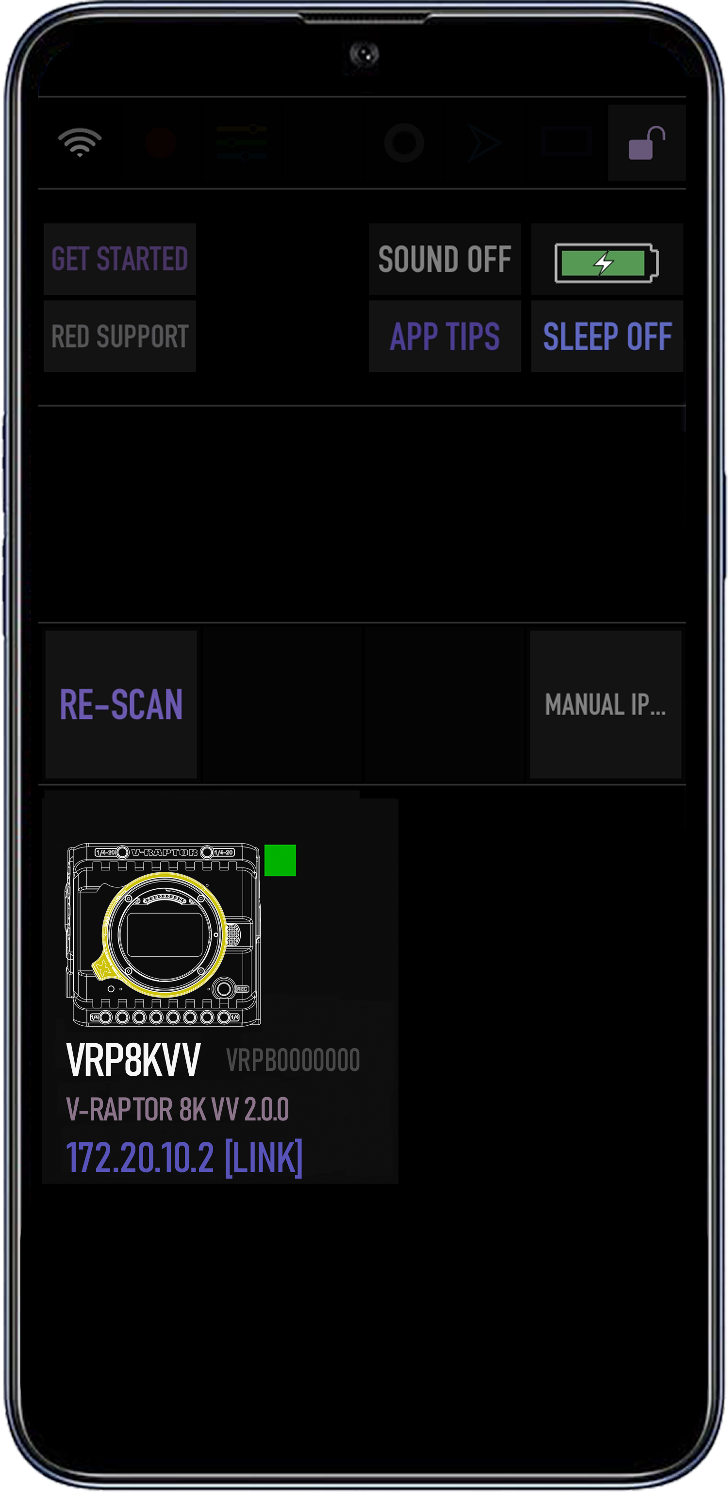- Tap the icon to open the RED Control app tools for the tethered camera.