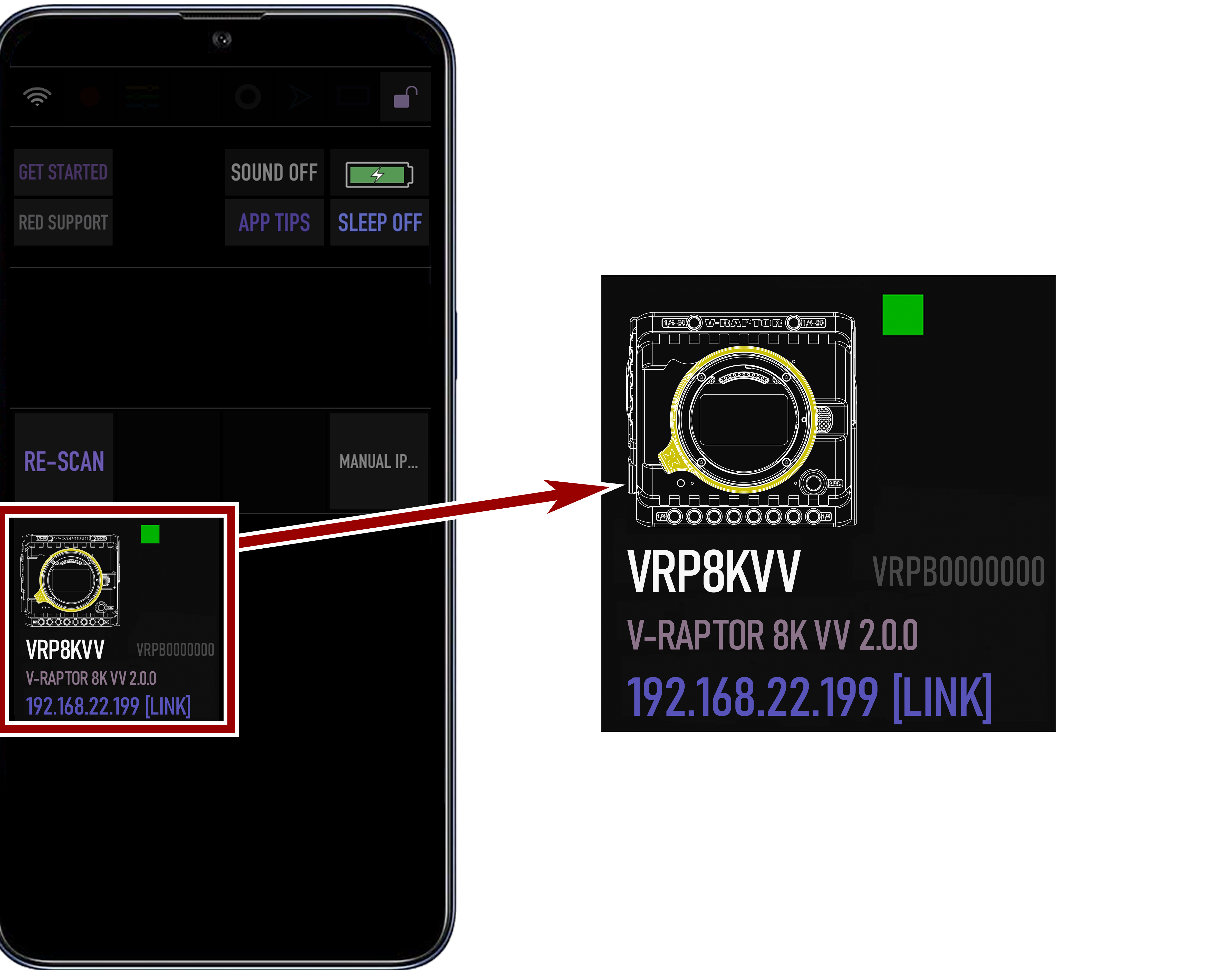 The RED Control app displays the camera connection icon.